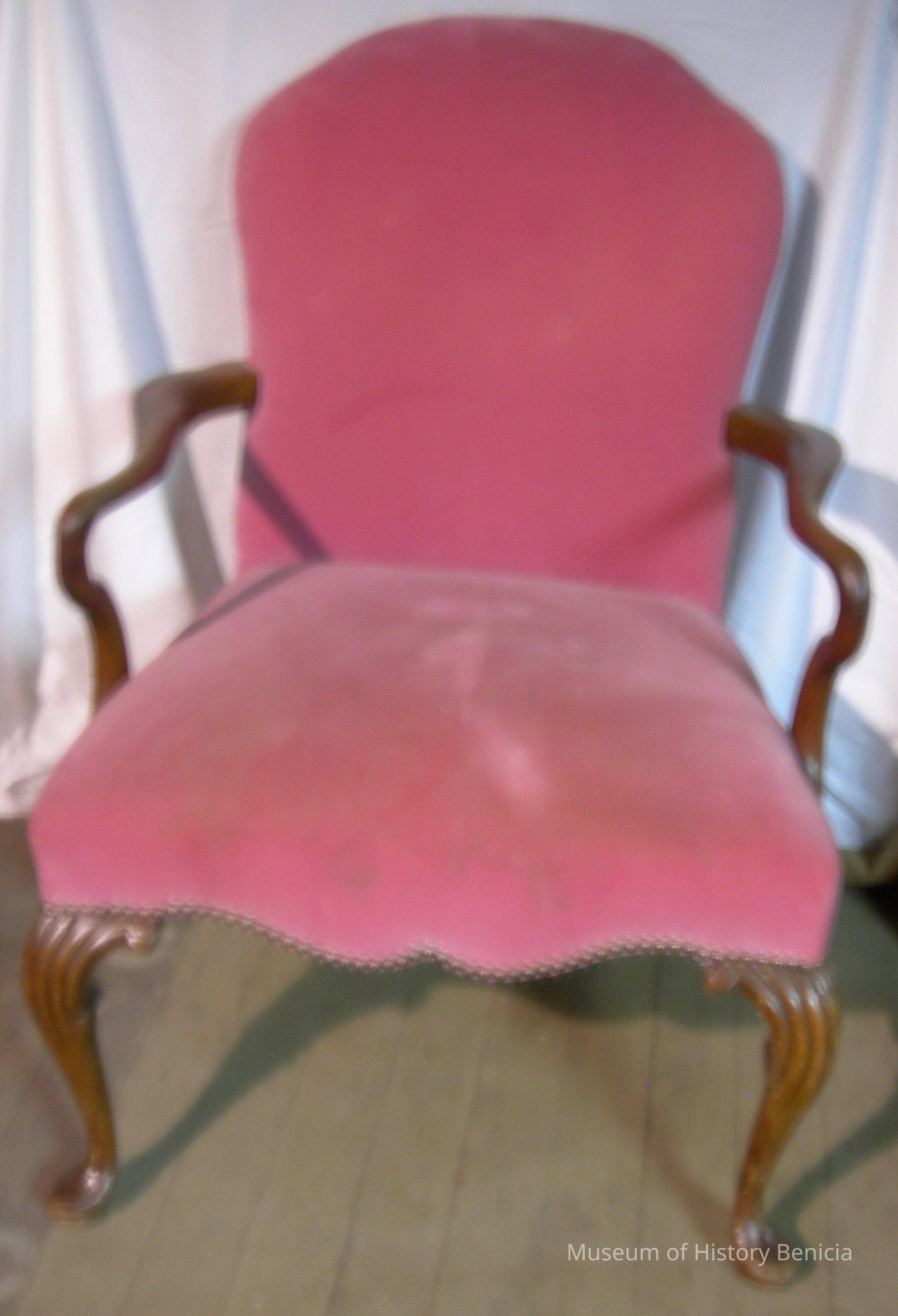 Upholstered Queen Anne arm chair, originally red but has faded to pink; has a soft suede-like feel.