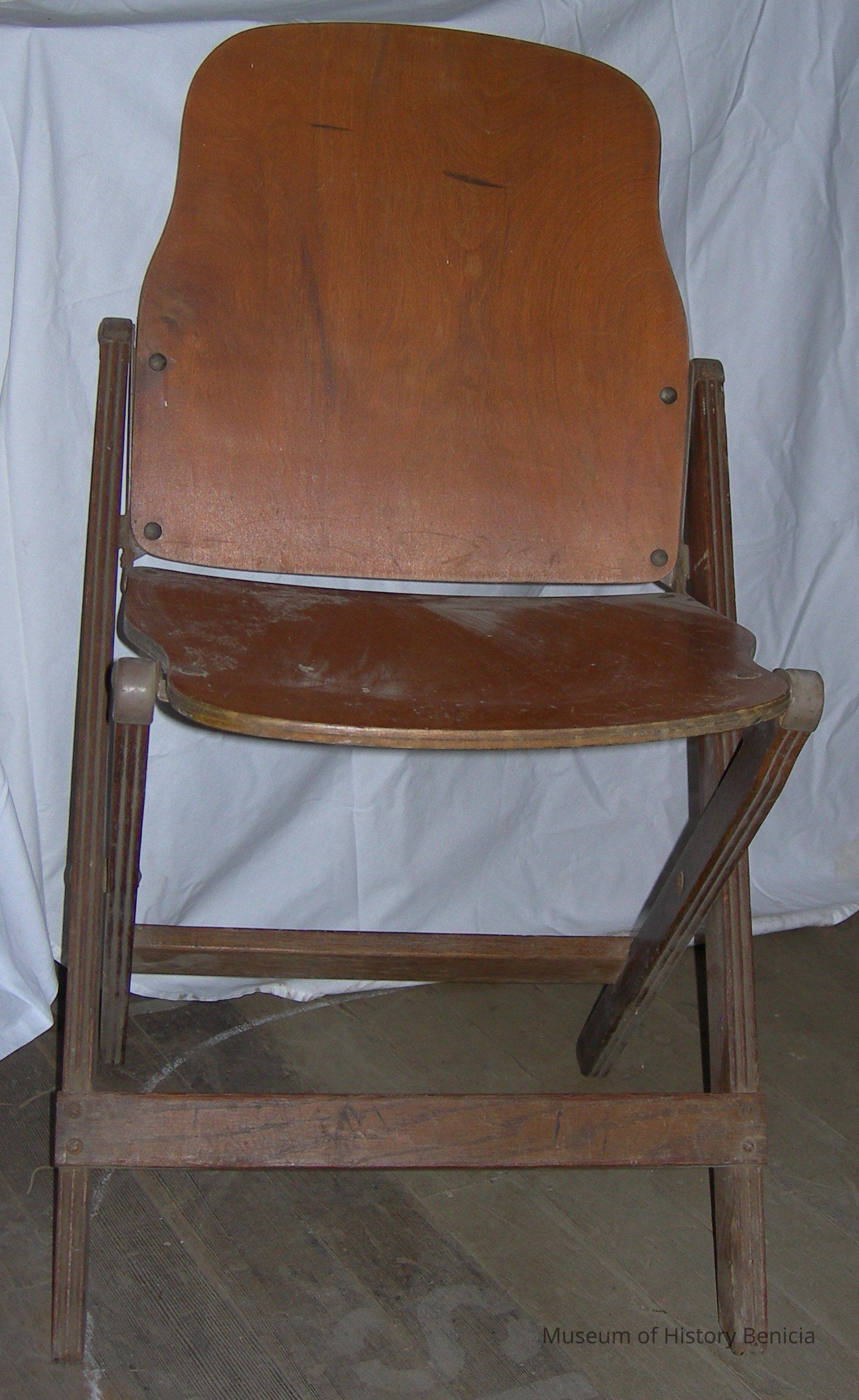 Folding chair with solid wood seat and back, has metal fittings; U S on underside of seat made by American Seating Co., Grand Rapids, Minn