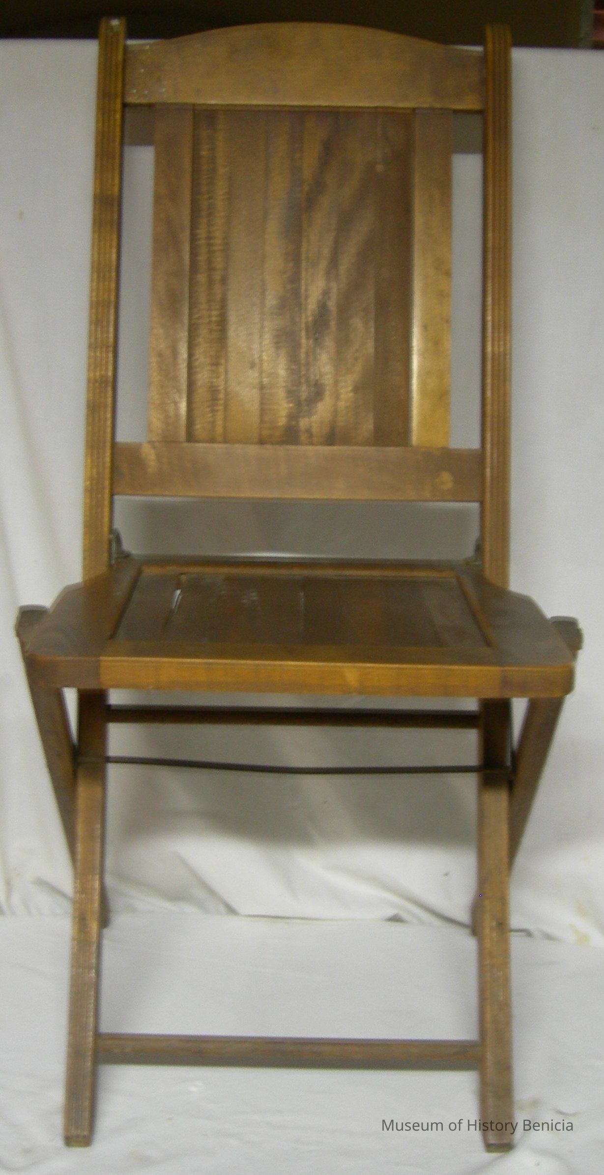 Folding chair - wood, slats in back rest and seat, one set of legs is curved at end 35" high x 15" wide; seat depth is 14"