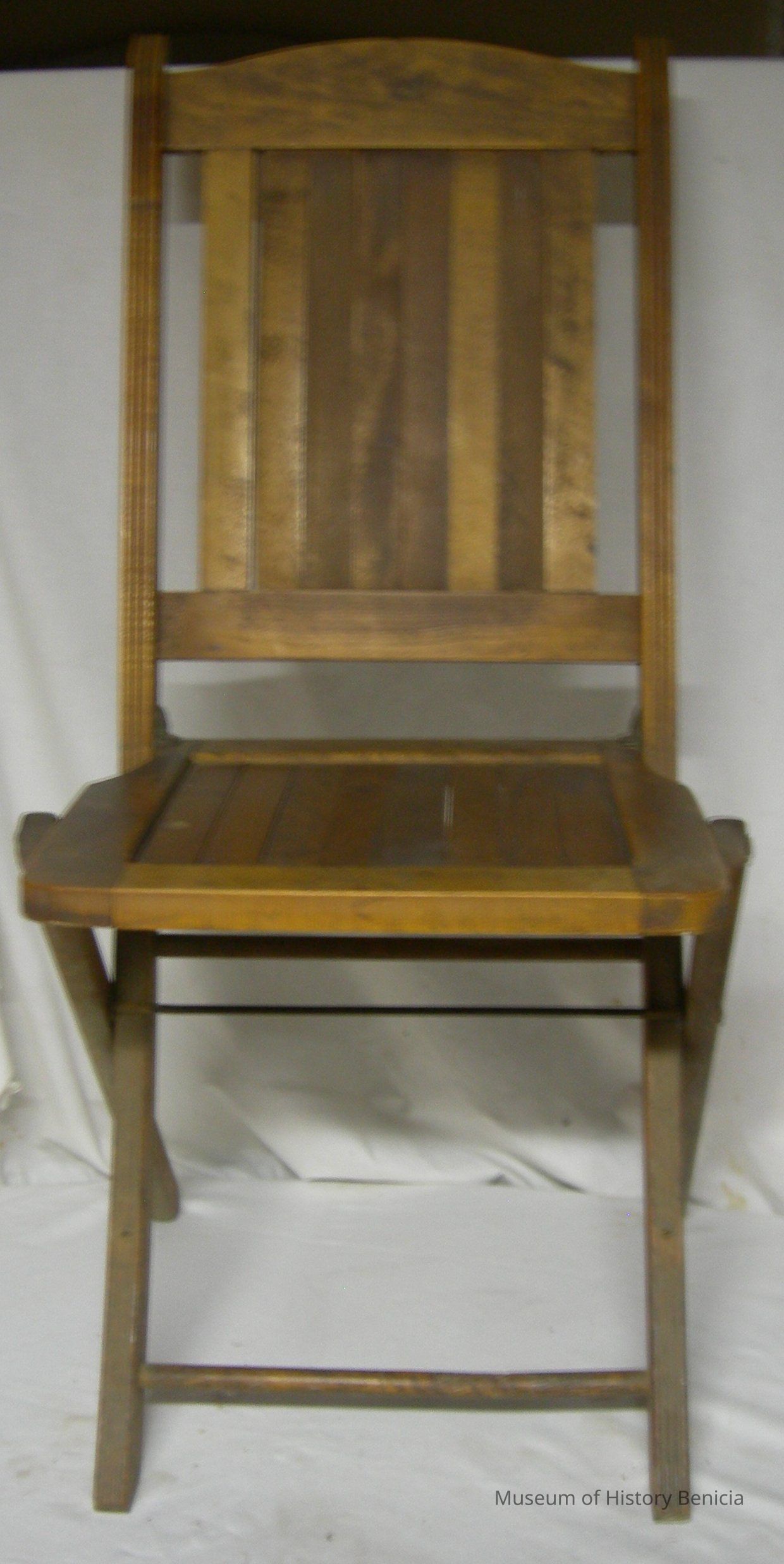 Folding chair - wood, slats in back rest and seat, one set of legs is curved at end 35" high x 15" wide; seat depth is 14"