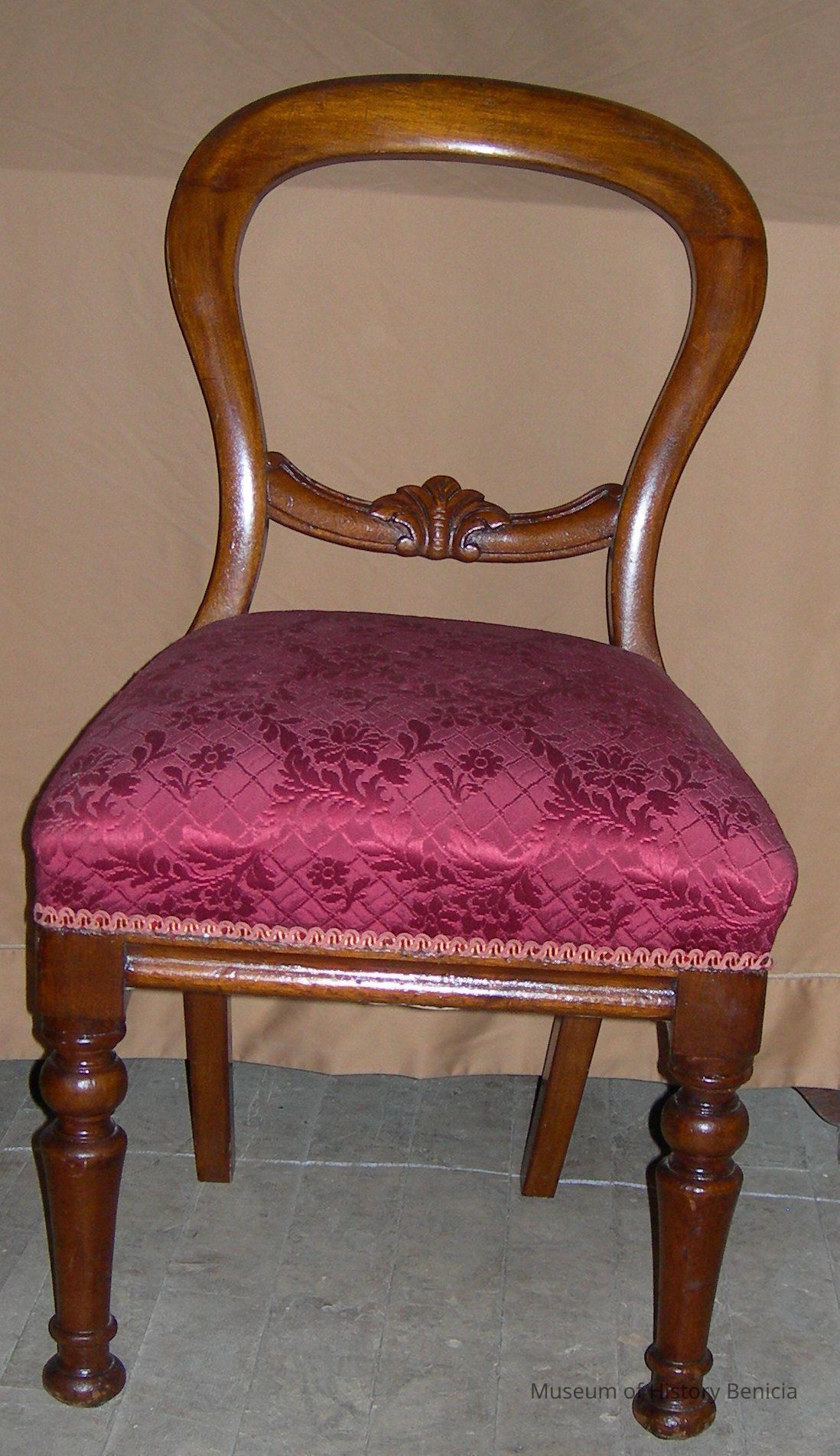 Upholstered chair, armless, cranberry red brocade, dark wood back and legs 35" high