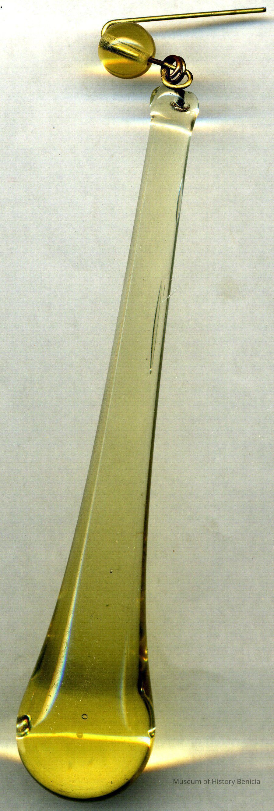 This is one of nine chandelier pendants either a teardrop or raindrop pendant. It may have been attached to a chandelier in a local school or church. They are in several different colors; clear, amber, blue and red. Each one is about 4.25" long and .75" at the large end. They all have a small glass bead attached to the small end where there is a brass wire.Collection
