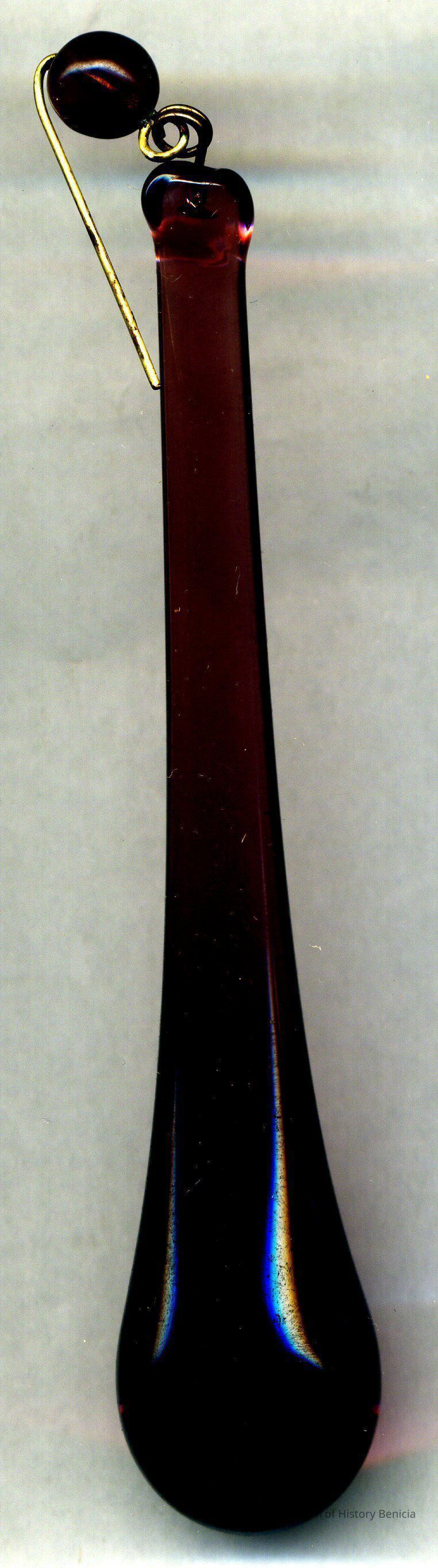This is one of nine chandelier pendants either a teardrop or raindrop pendant. It may have been attached to a chandelier in a local school or church. They are in several different colors; clear, amber, blue and red. Each one is about 4.25" long and .75" at the large end. They all have a small glass bead attached to the small end where there is a brass wire.Collection