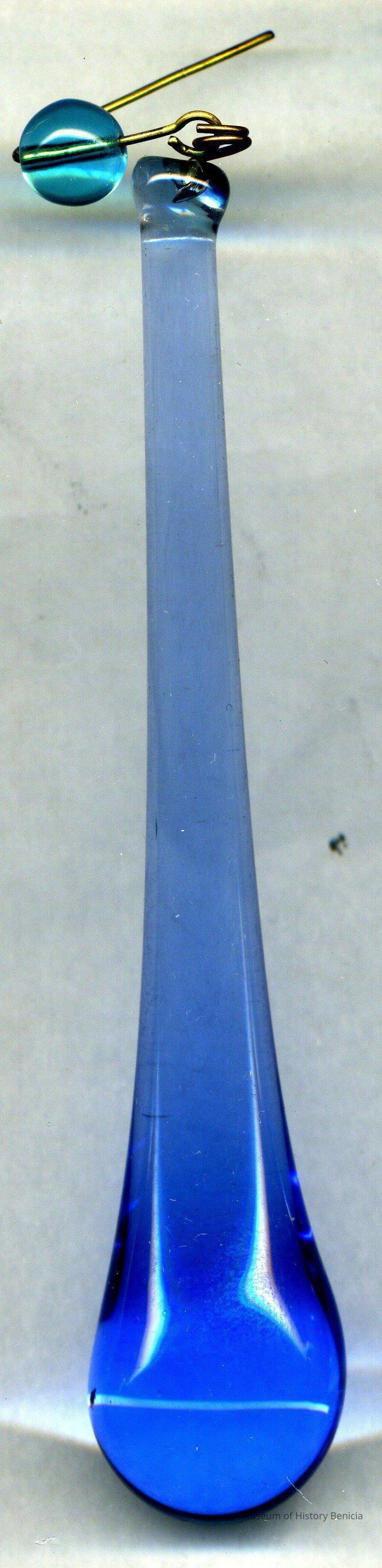 This is one of nine chandelier pendants either a teardrop or raindrop pendant. It may have been attached to a chandelier in a local school or church. They are in several different colors; clear, amber, blue and red. Each one is about 4.25" long and .75" at the large end. They all have a small glass bead attached to the small end where there is a brass wire.Collection