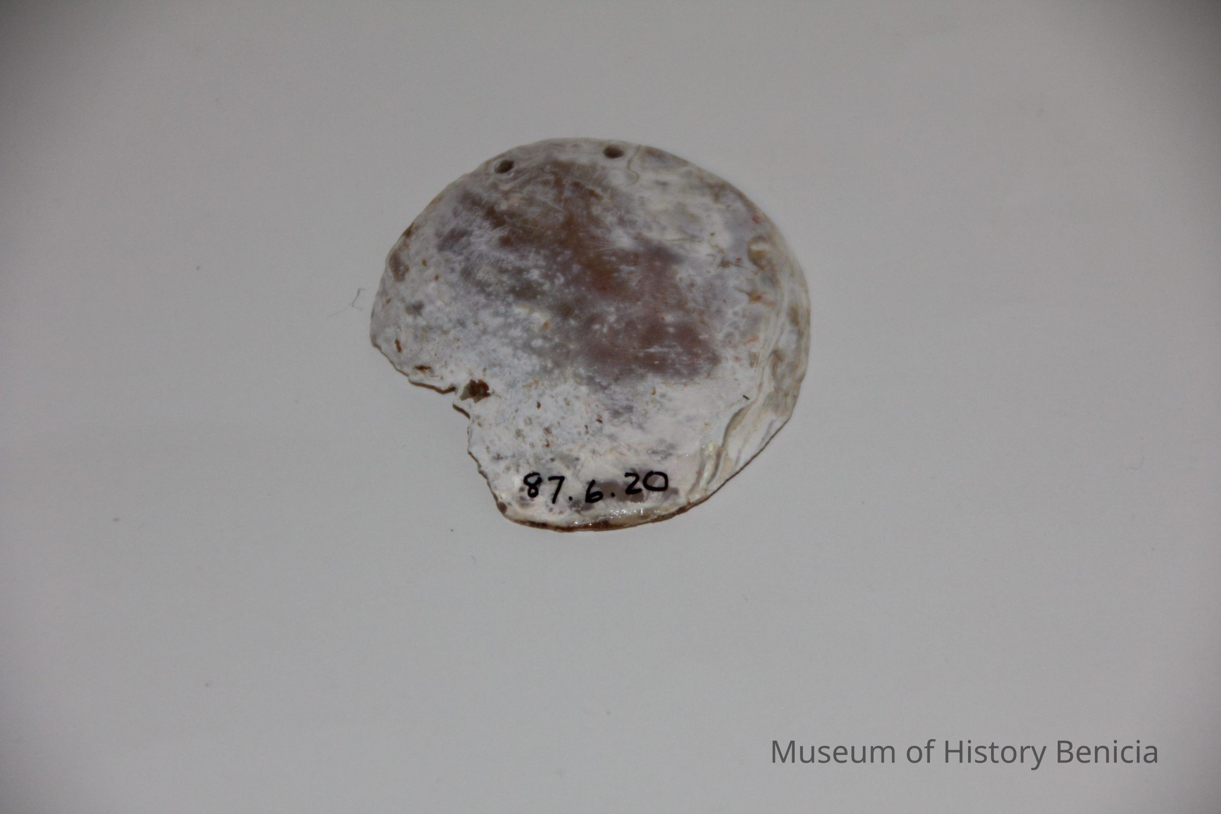 oval abalone shell w/two holes drilled through at one edge, six shallow holes on edges originally cataloged by HC