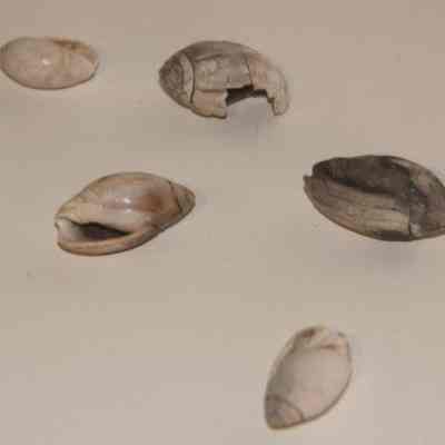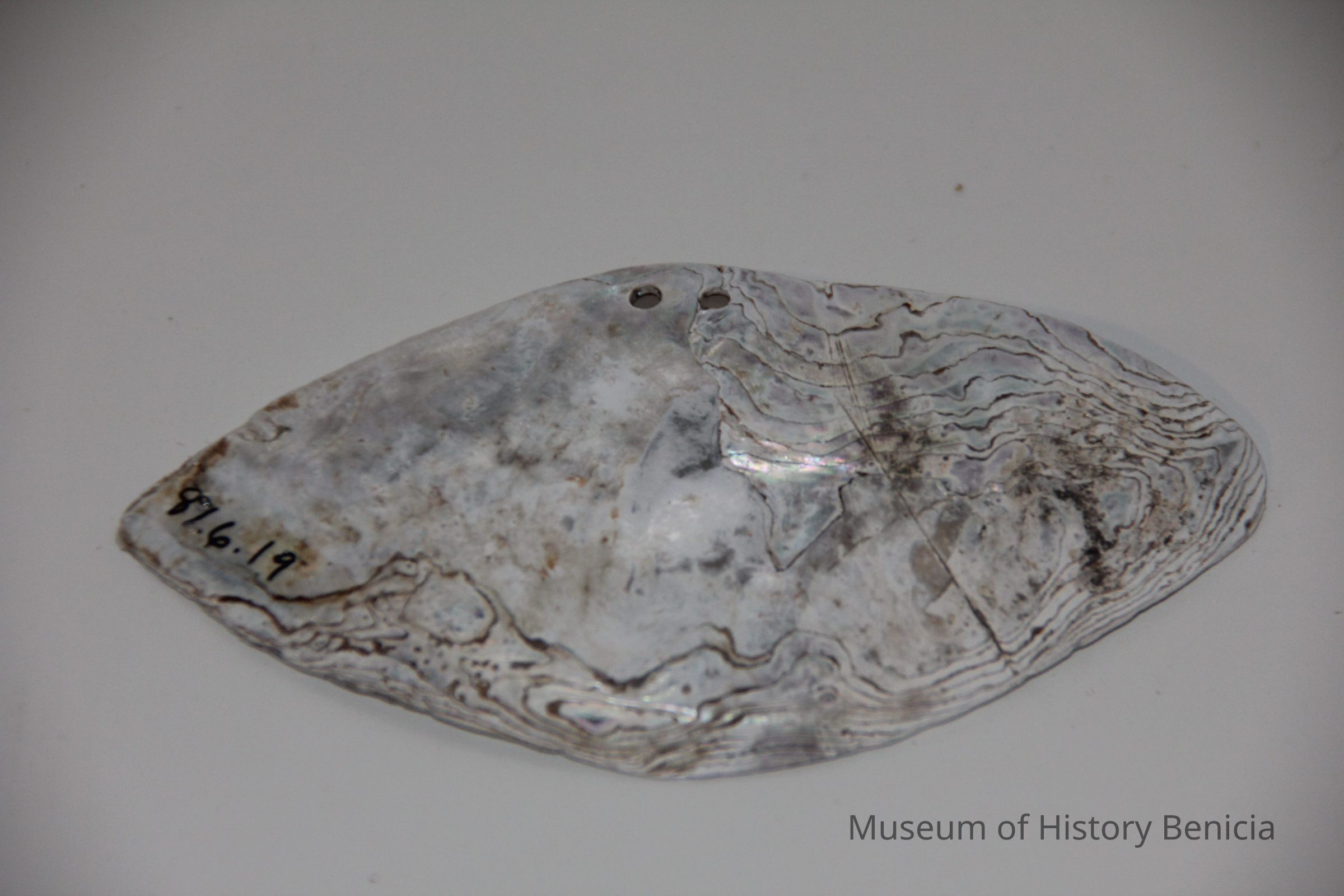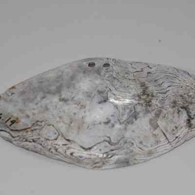 Abalone shell with two small holes drilled in side. Also a group of small shells used in exhibit.