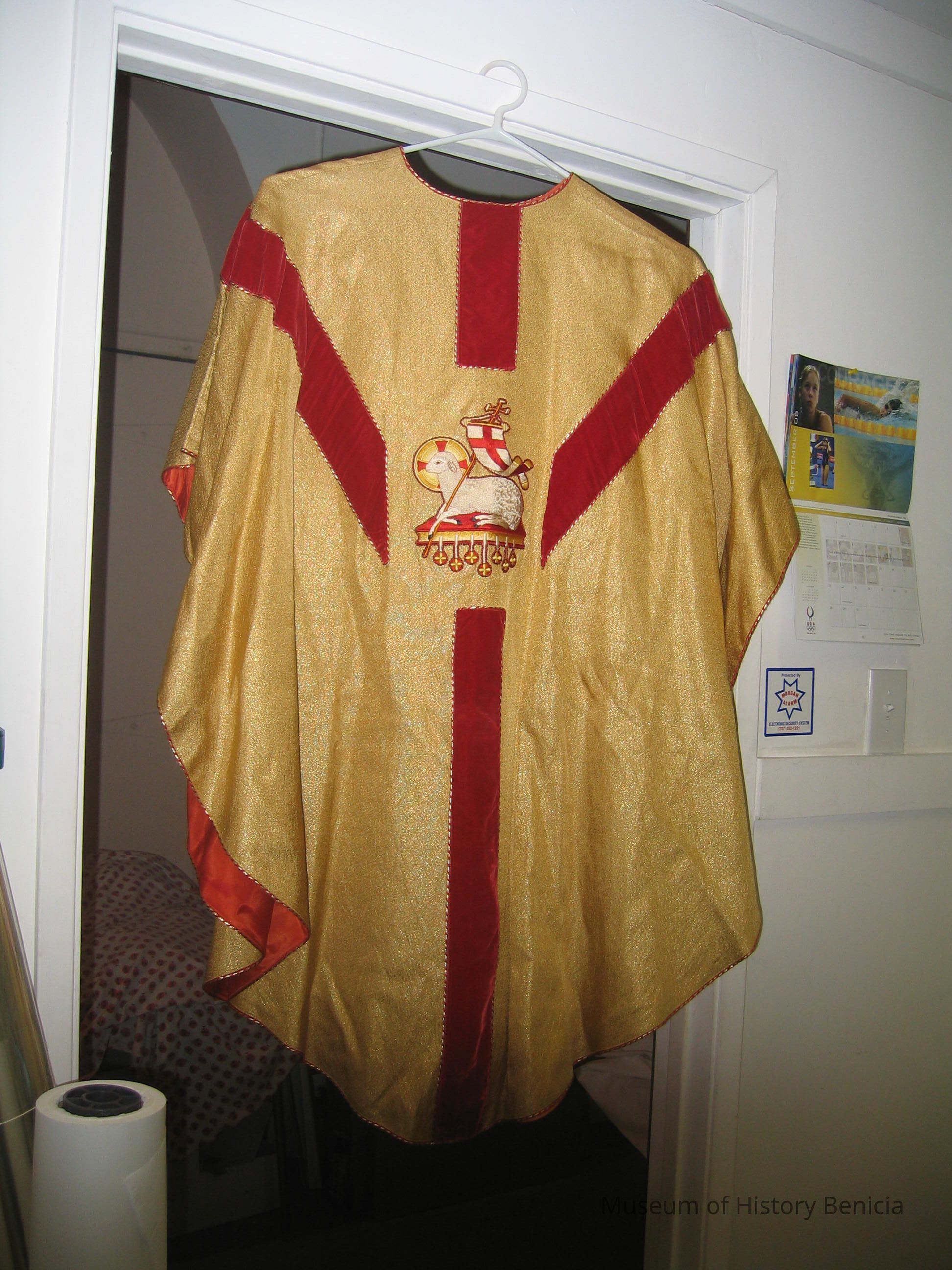 Gold and red Chasuble with lamb decor on the front. Worn by priests at St. Dominics Church in Benicia.