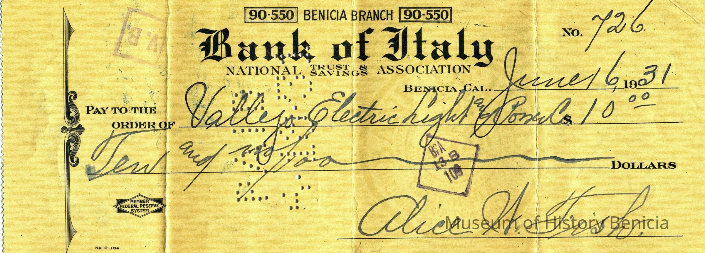Checks written on "Bank of Italy" by Alice W Fish for various amounts. They are dated June, July and August of 1931. All are made out to Vallejo Electric and Light Co. Check numbers are 726, 757 and 776.