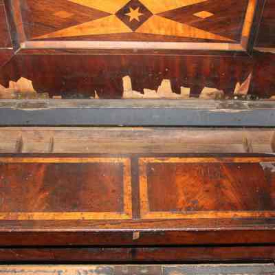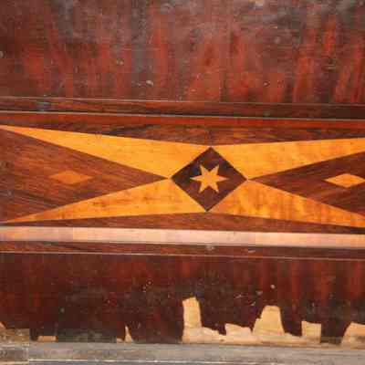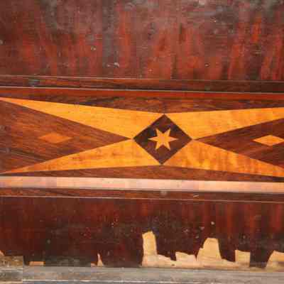 Three compartments within chest, each at different level; can be slid from front to back. It has rope hands on each side Top compartment has a decorative design in wood-inlay. Chest cover is hinged. Inside on cover is also a decorative wood-inlay design, which includes stars and diamonds.