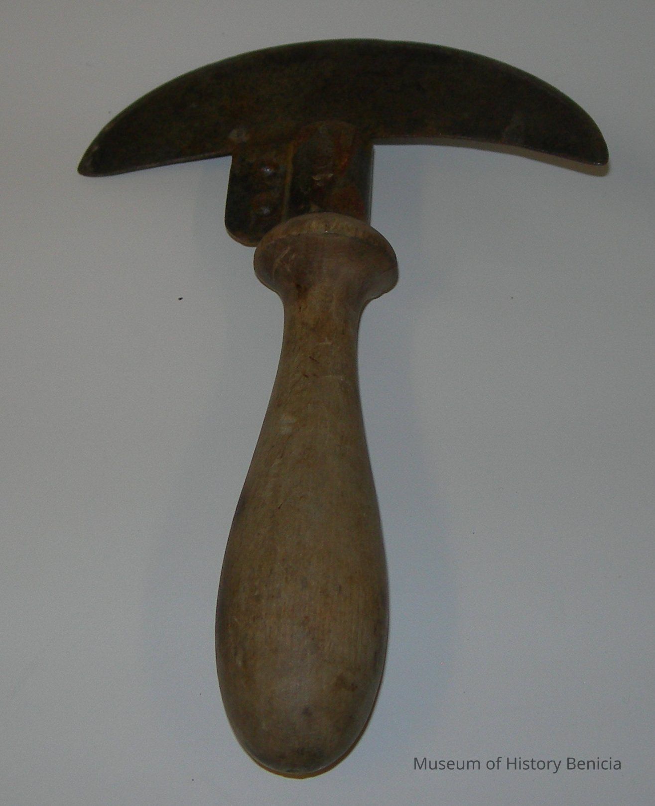 curved blade food chopper; metal blade with wooden handle, probably used with a small curved bowl