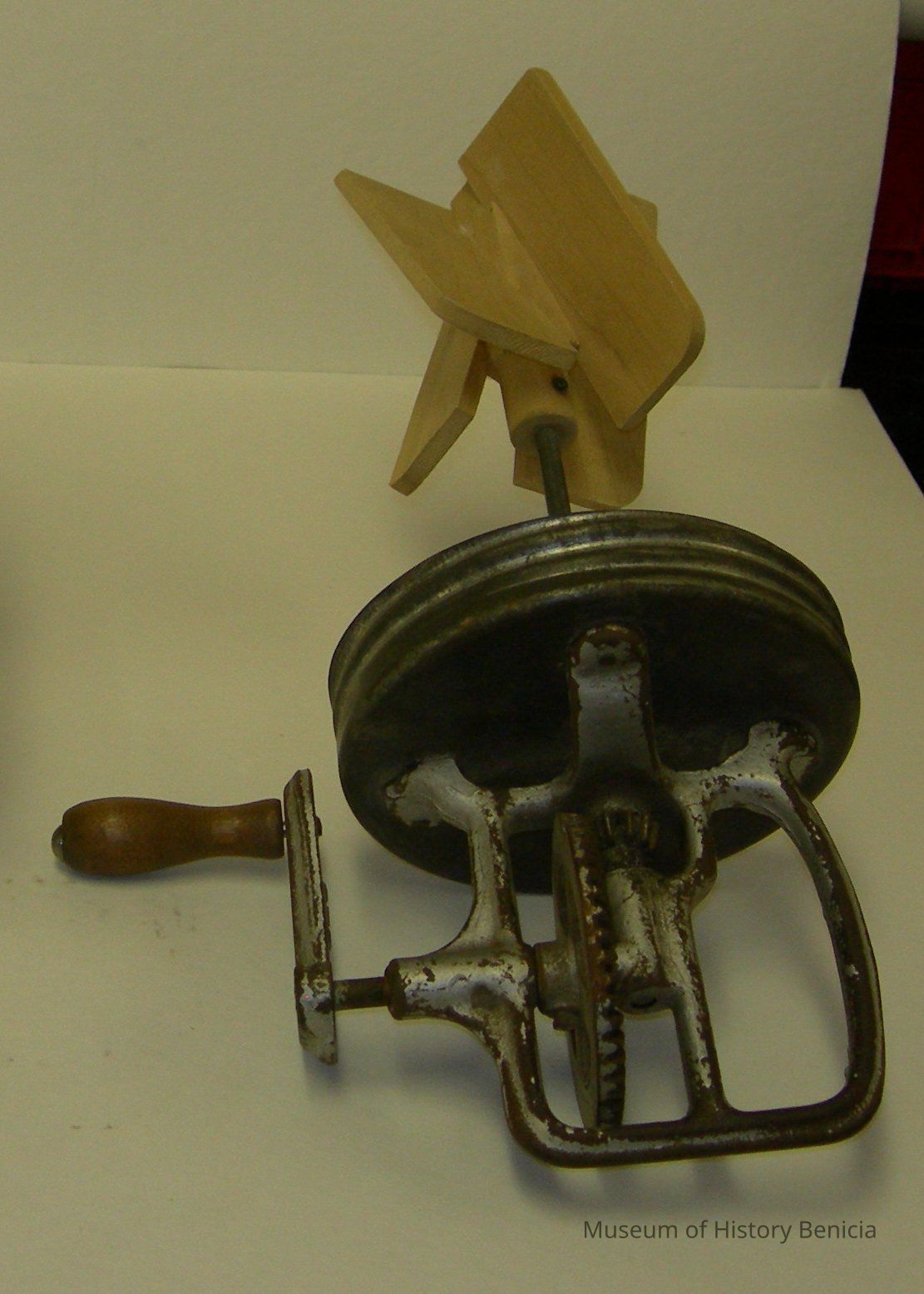 wooden paddles appear to be new, perhaps they were replaced; there is rust and wear on the outer part of the turning mechanism on the outsideCollection