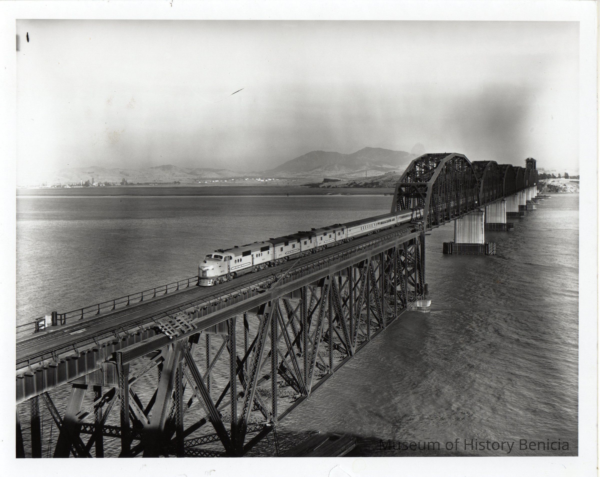 B/W Photograph: "City of San Francisco" streamliner train crossing Benicia-Martinez bridge, 1946.
