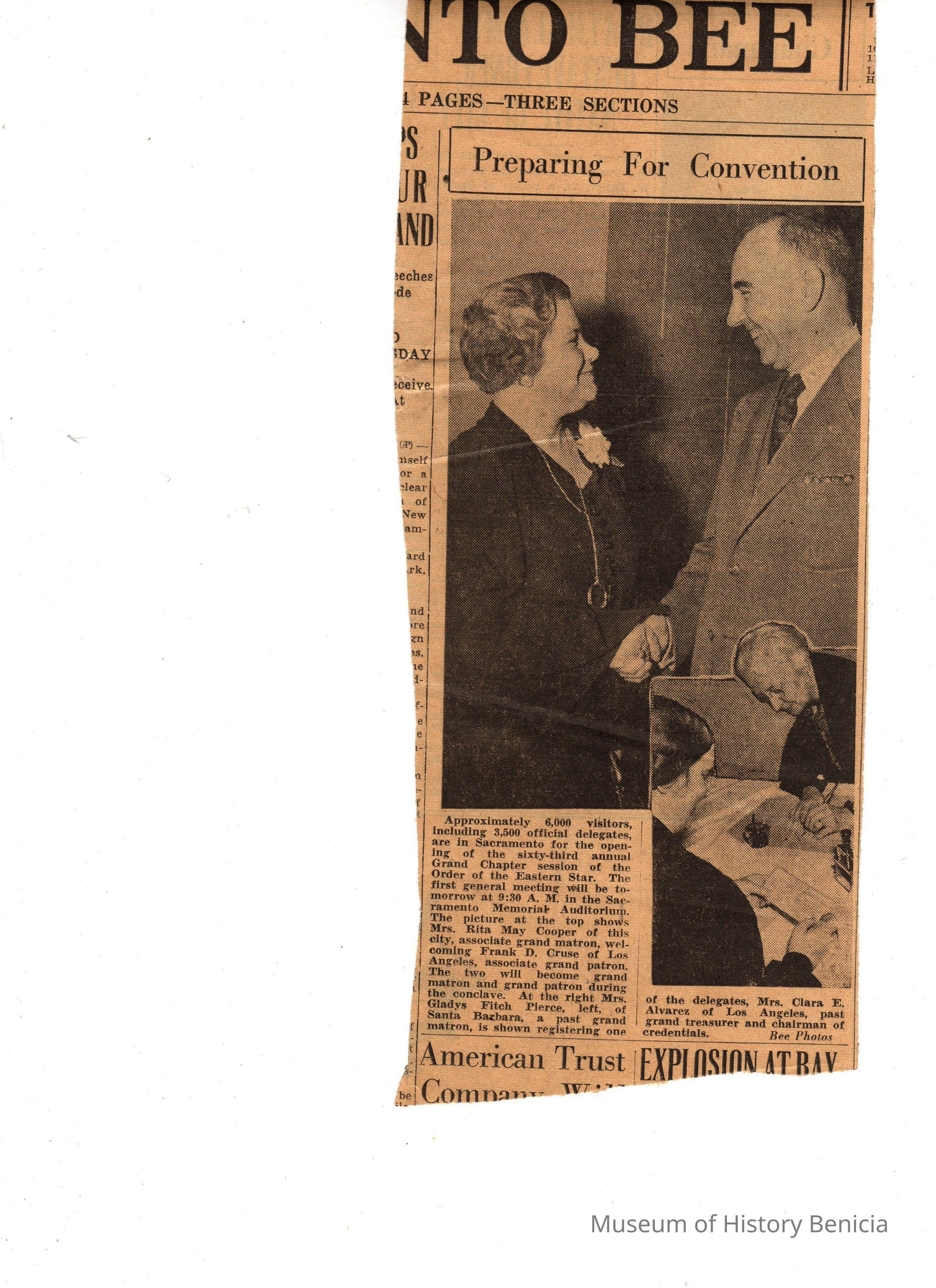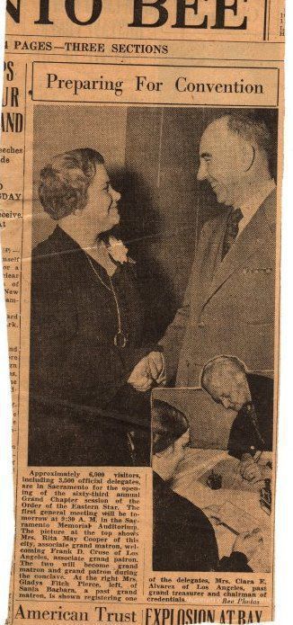 Newspaper photograph from the "Sacramento Bee" about an Eastern Star Officer: Mrs. Rita May Cooper, the Grand Conductress of the California Grand Chapter of the Order of the Eastern Star.