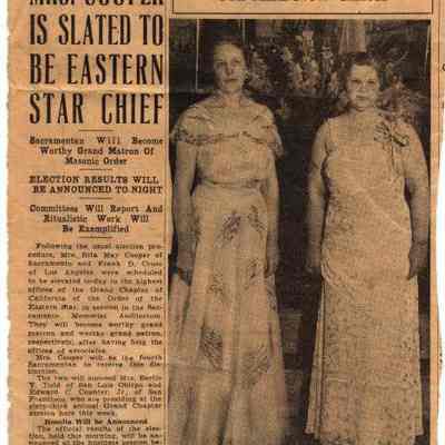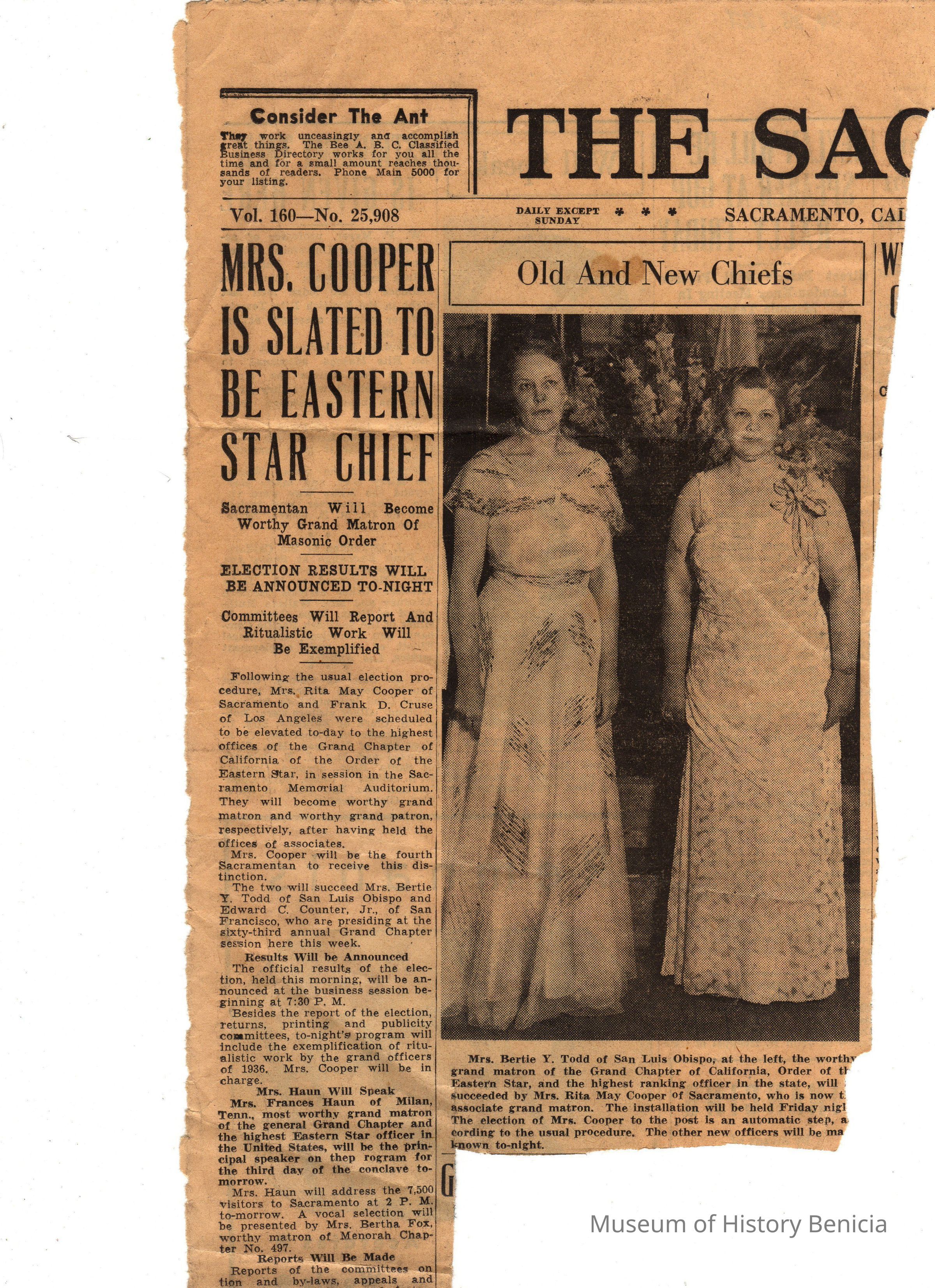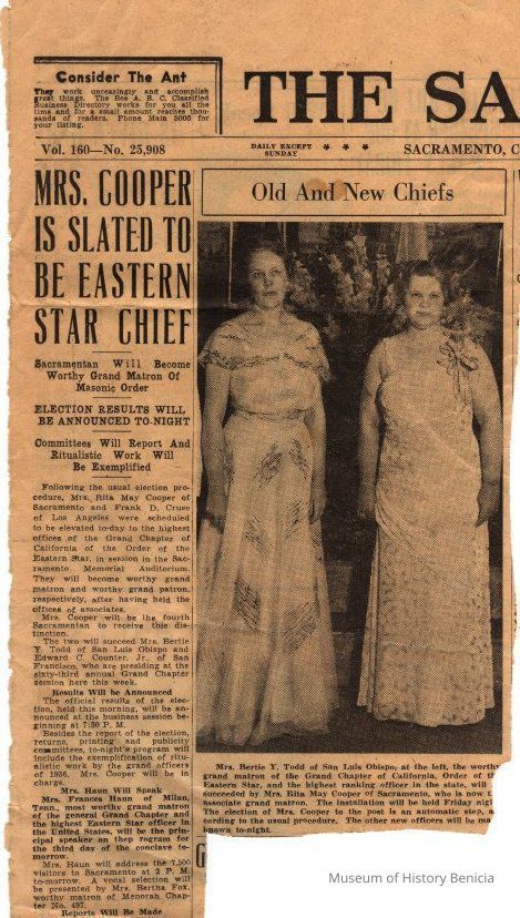 Newspaper clipping/photograph from "The Sacramento Bee": regarding the incoming (Mrs. Rita May Cooper) and outgoing (Mrs. Bertie Y. Todd) "Chiefs" of the Eastern Star