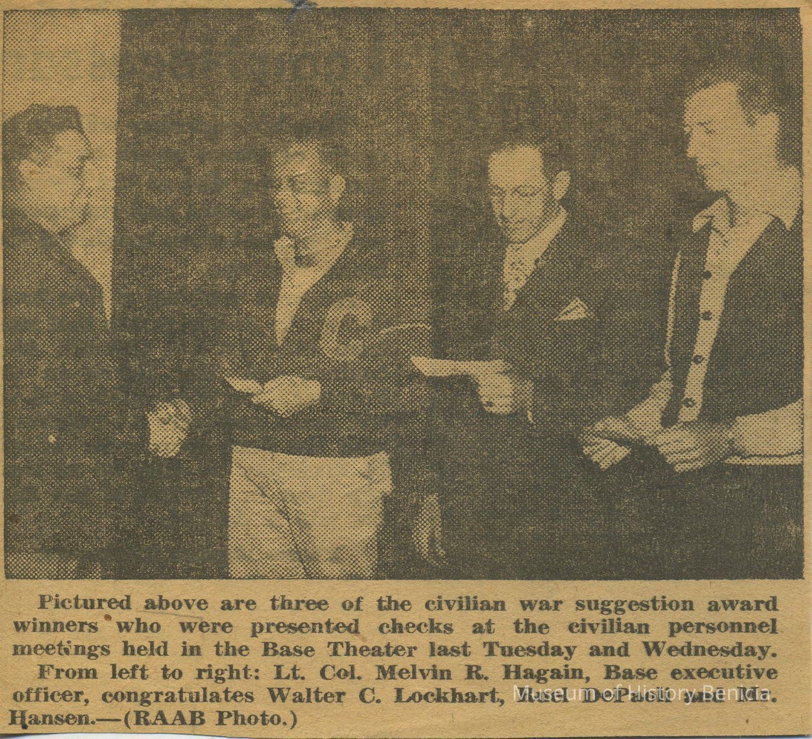 Newspaper clipping/photograph of Walter C. Lockhart receiving a suggestion award in Reno, NV; he won $250 for his suggestion to improve the safety of wing removal from planes when a repair is needed.