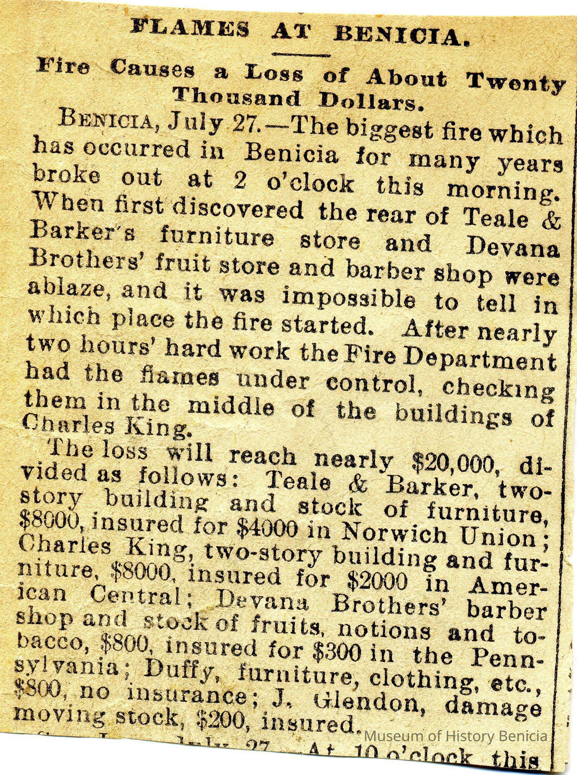 A clipping from a newspaper (078/27/1897) about the fire in Benicia that burned the Teale & Parker furniture store, Devana Brother's fruit store and barber shop. The overall loss was set at about $20,000.Collection