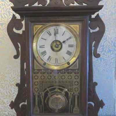 Seth Thomas mantle clock, U.S.A. on face, Roman Numeral. Glass front door with gold painted design on it. Fancy carved woodwork on the brown, casing wood. Eight day and time strike. 21-1/2" in length, 14" in width, 5-1/2" in depth.