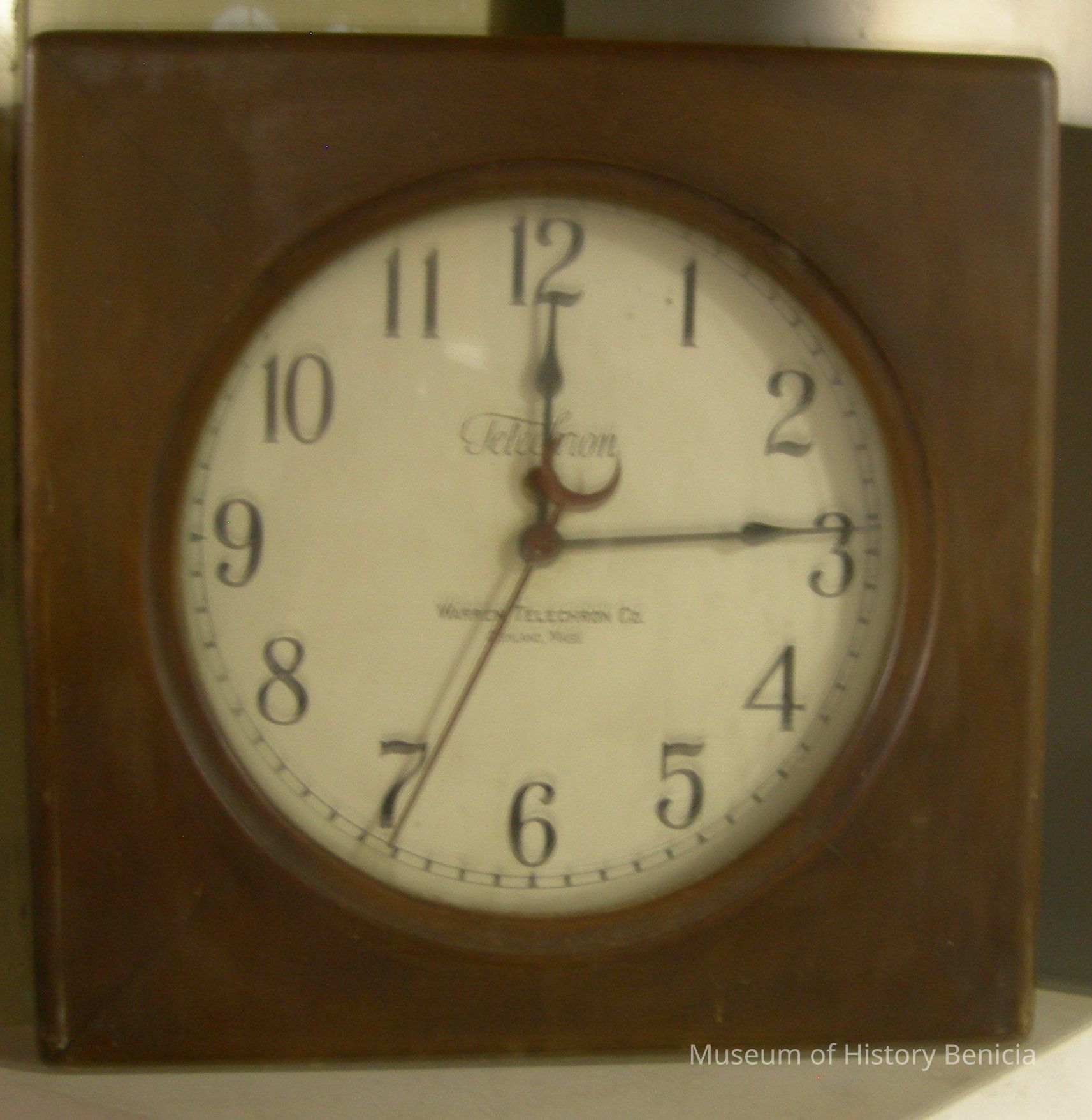"Telechron Warren Telechron Co. Ashland, Mass." printed center front; sweep second hand; keyhole top center (?); motor patented 1924. length 16" x width 16" x depth 4-3/4"