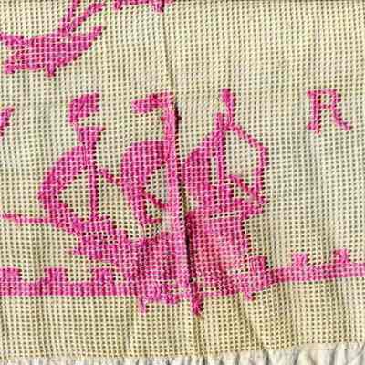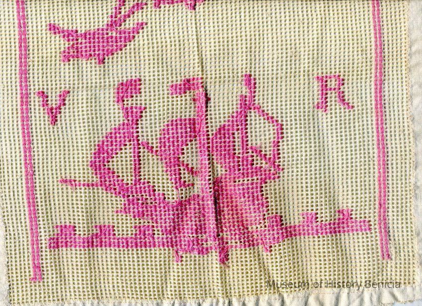A cleaning cloth with the initials "V" and "R" and a sailing ship with birds overhead.