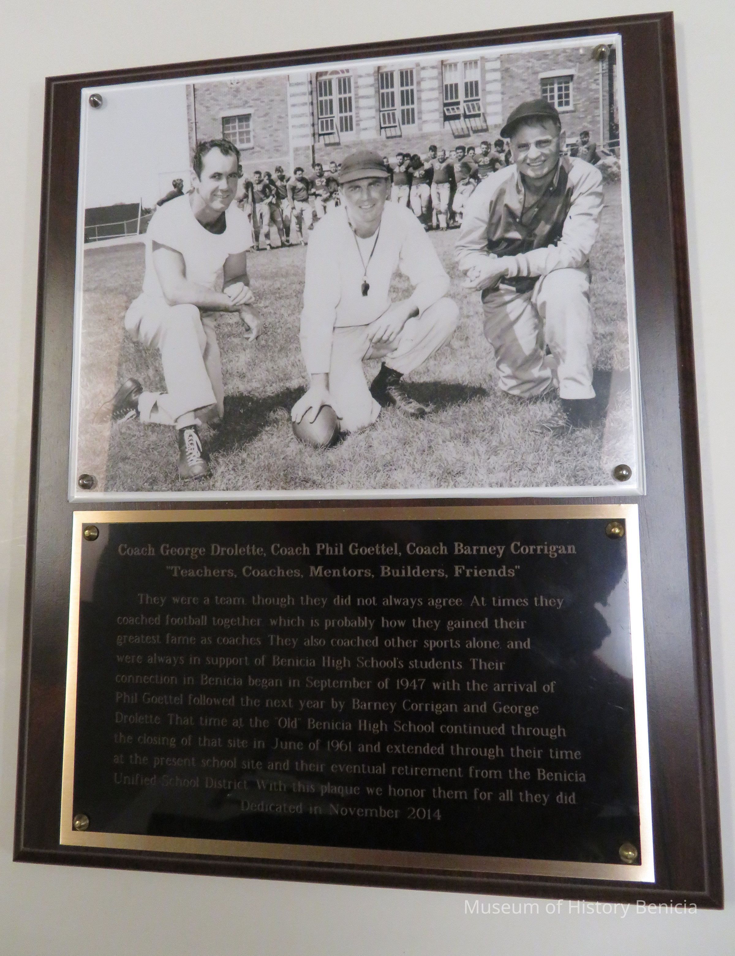 Plaque honoring three Benicia High School football coaches. They were: Coach George Drolette, Coach Phil Goettel, and Coach Barney Corrigan. Under the 8 x 10 black and white picture of the above coaches is written the following:
