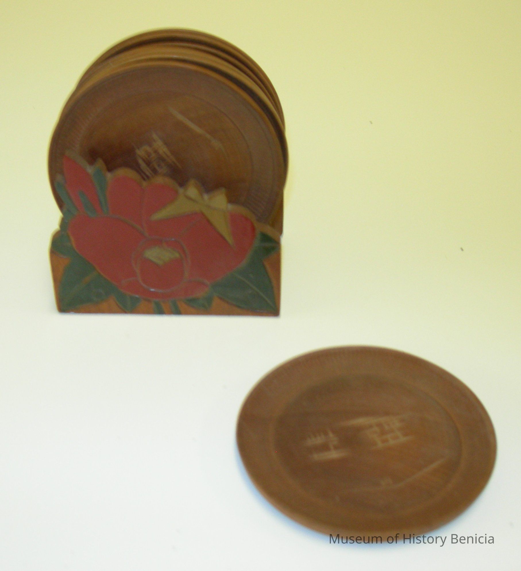 1994.028.0031i - wooden holder for the coasters; has red, yellow and green flower design on a brown wood background on each side 3" x 2" x 2-1/2"Collection