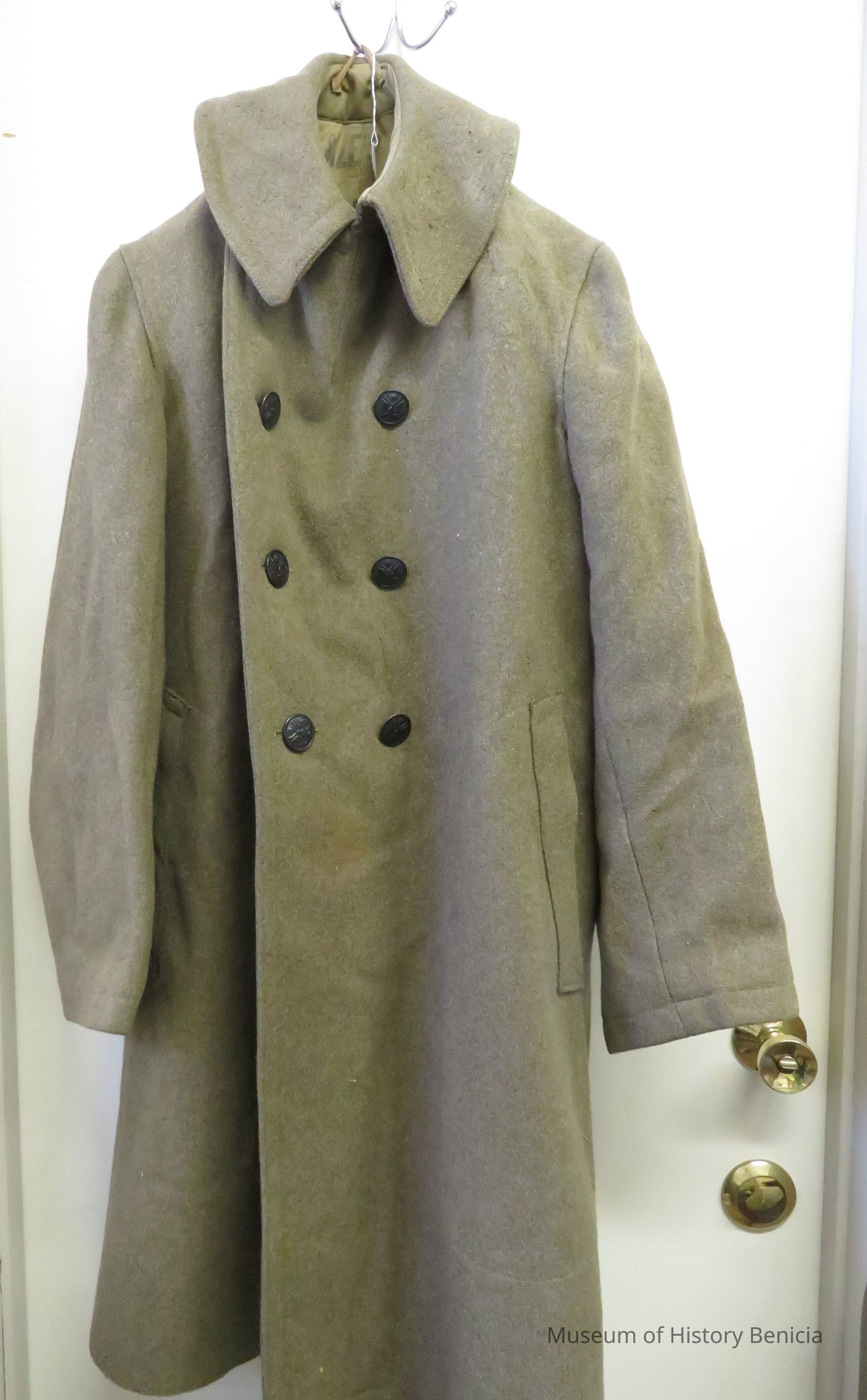 World War I coat belonging to Carl Lunsted Sr., WWI veteran. Army green wool with 6 buttons. Inside is stamped "Size 3, USA and C.A.L.