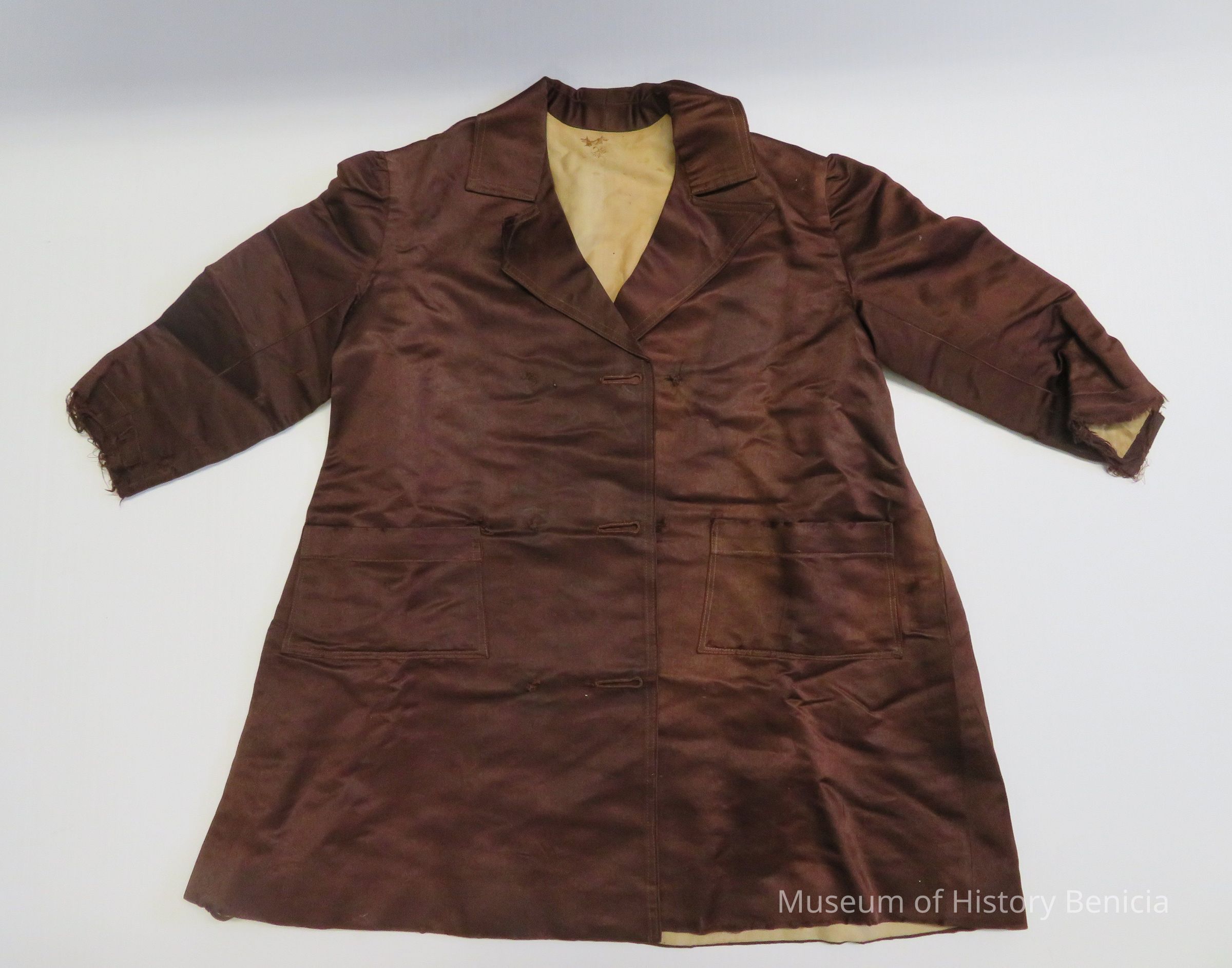 double breasted with six buttons (all missing) and three button holes; there are two pockets, one on each side; there are no labels.Collection