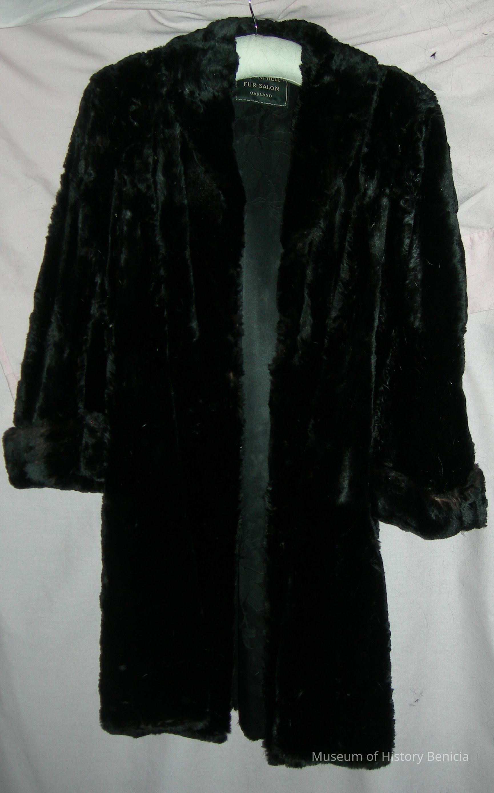 Fur Coat - Black, calf-length, with black satin lining and silver floral design; Tag: H.C. Capwell's Co. Fur Salon, Oakland