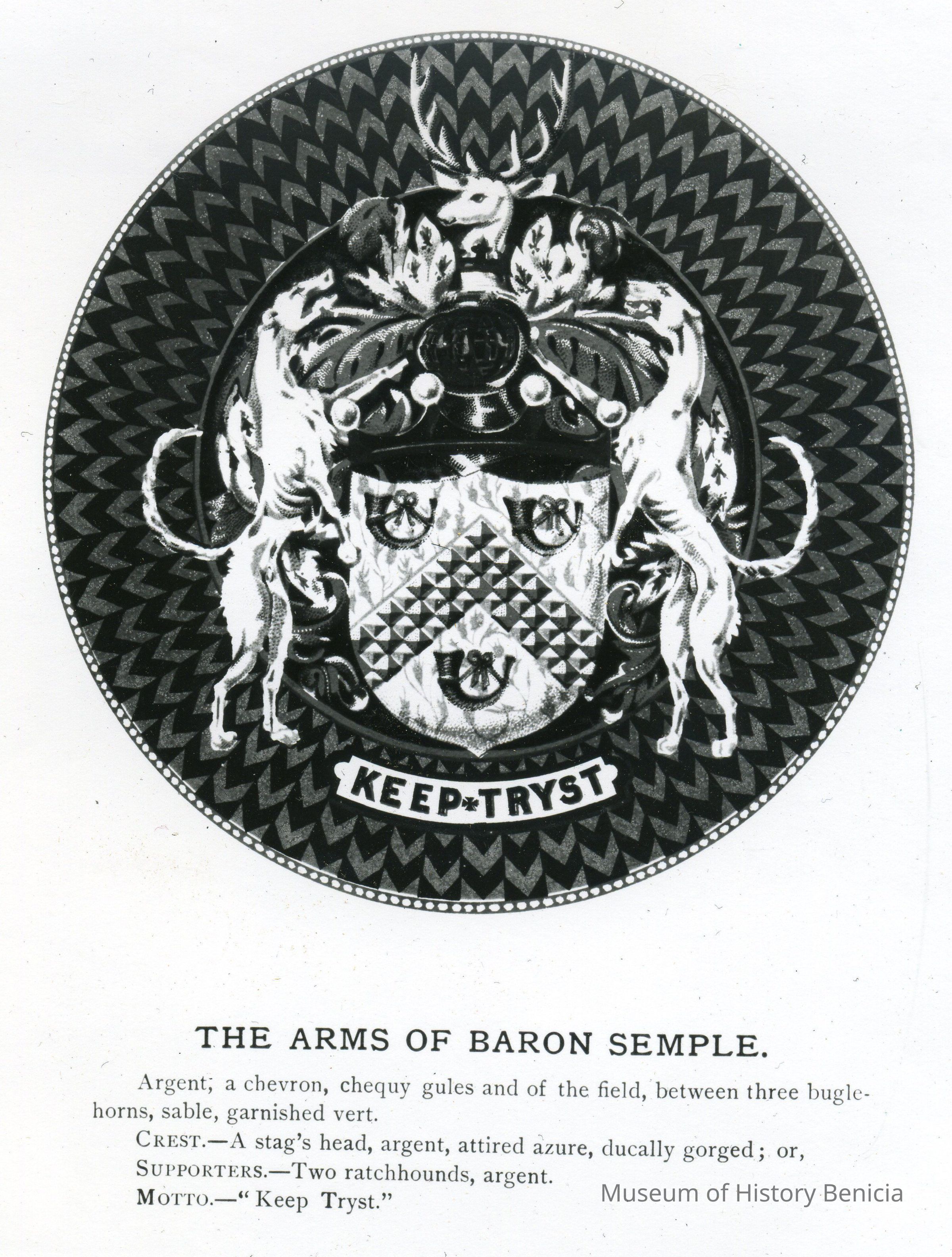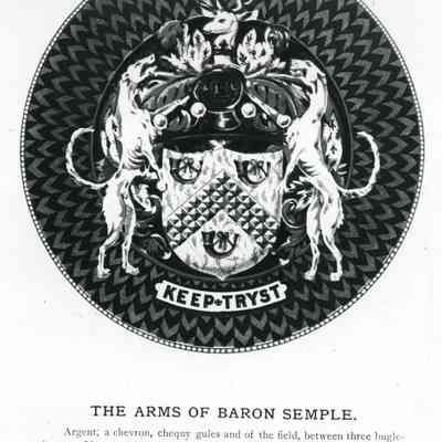 Depiction of the Coat of Arms for the Semple family. The document states 'The Arms Of Baron Semple'. 'Keep Tryst' is on the bottom of the coat.