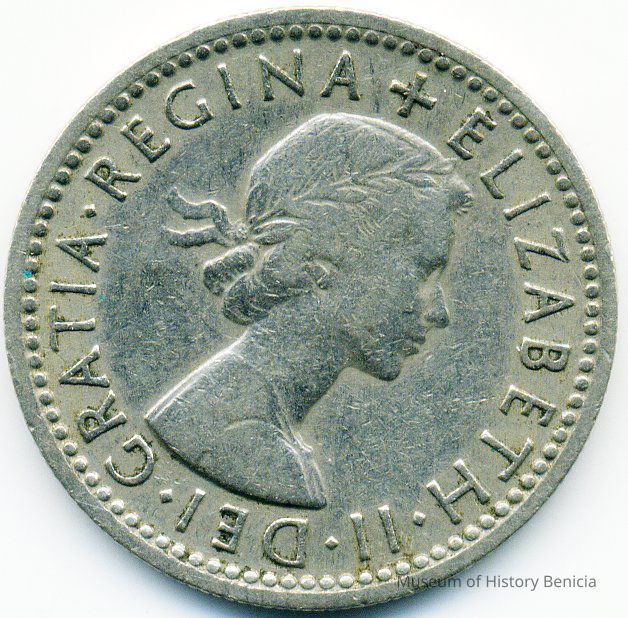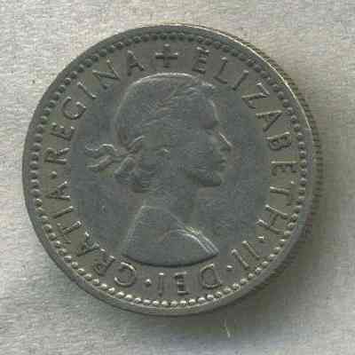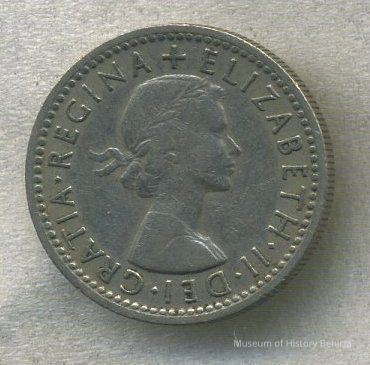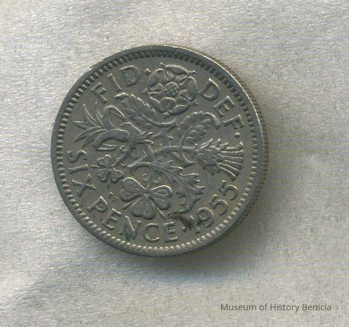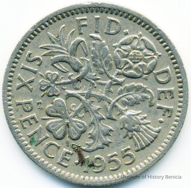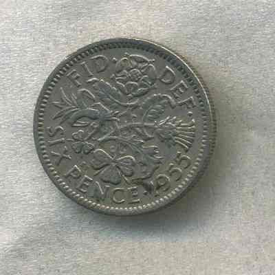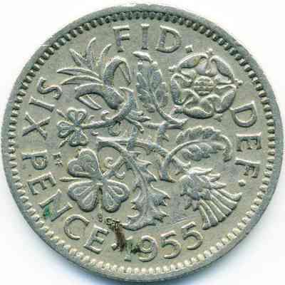 Coin - "FID. DEF. Sixpence 1955" around 4 sprigs for the 4 kingdoms of Great Britain (Tudor rose for England, leek for Wales, thistle for Scotland and shamrock for Ireland) on reverse side and Queen Elizabeth II on the obverse.