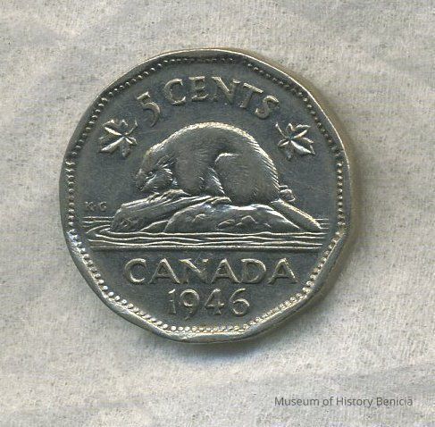 Coin - twelve sided, five cent Canada 1946 - Beaver on reverse; King George VI on obverse. 13/16" diameter