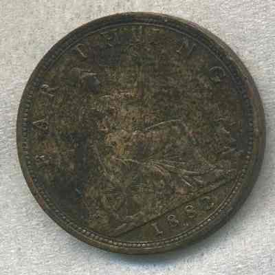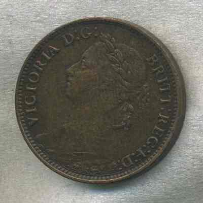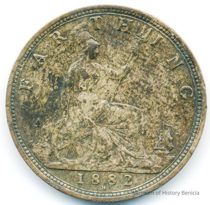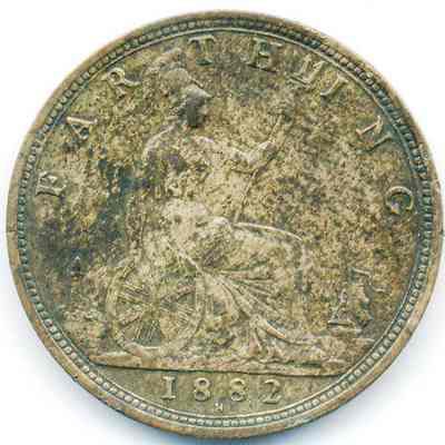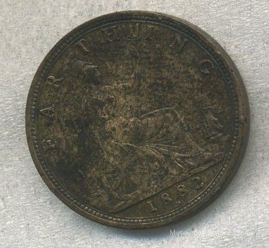 Coin - "Farthing 1882" and seated Britannia facing right with trident on reverse and Queen Victoria on obverse. This is a Victoria "Bun Head" variety made of bronze.
