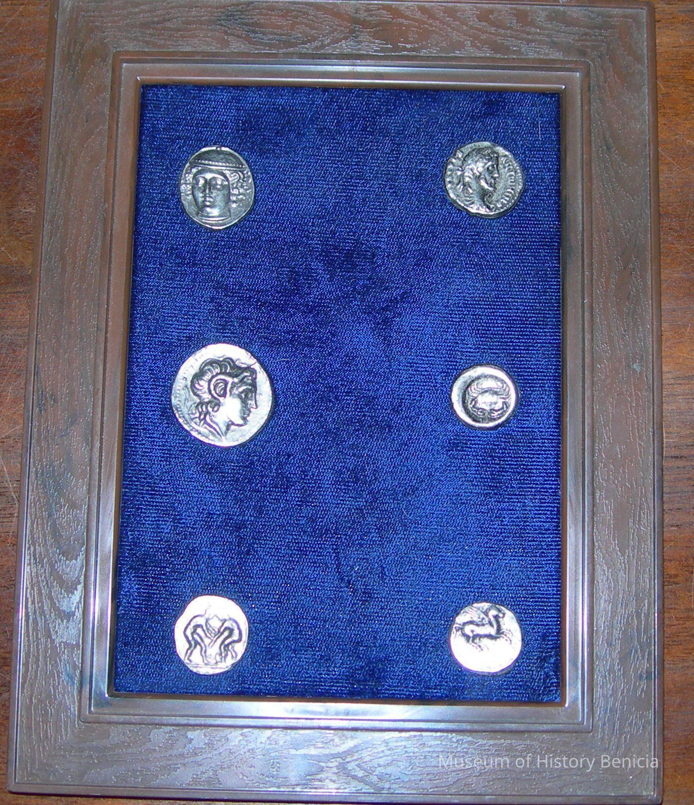 Six coins framed on blue felt, no glass, brown plastic frame; descriptions on back: