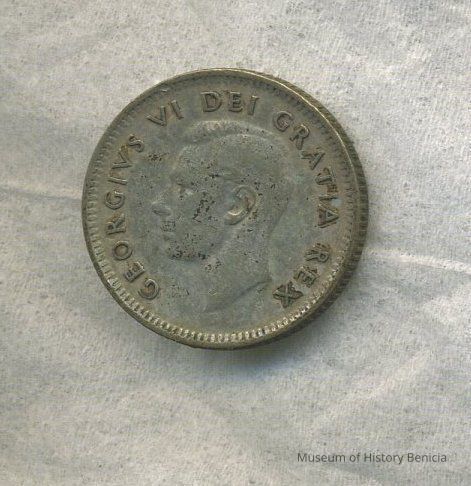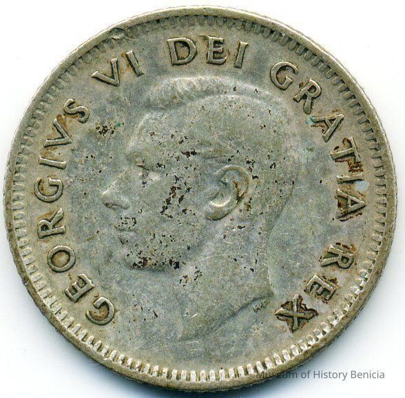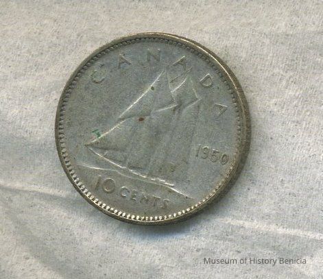 Coin - ten cent Canada 1950 - Sailing Ship on reverse; King George VI on obverse. 11/16" diameter