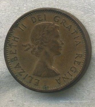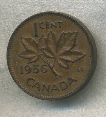 Coin - One cent Canada 1956 - Queen Elizabeth II on obverse and maple leaves on the reverse. size: 3/4" diameter