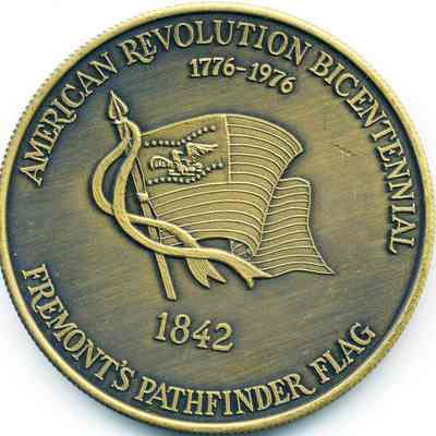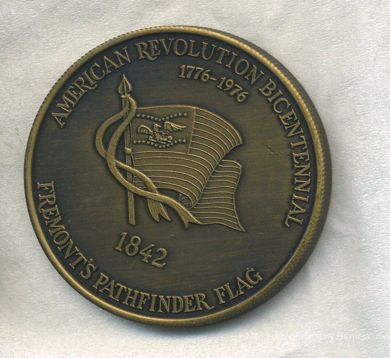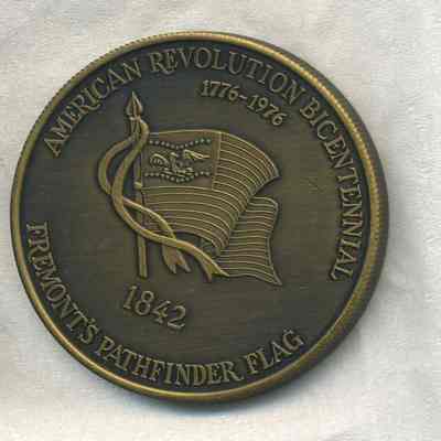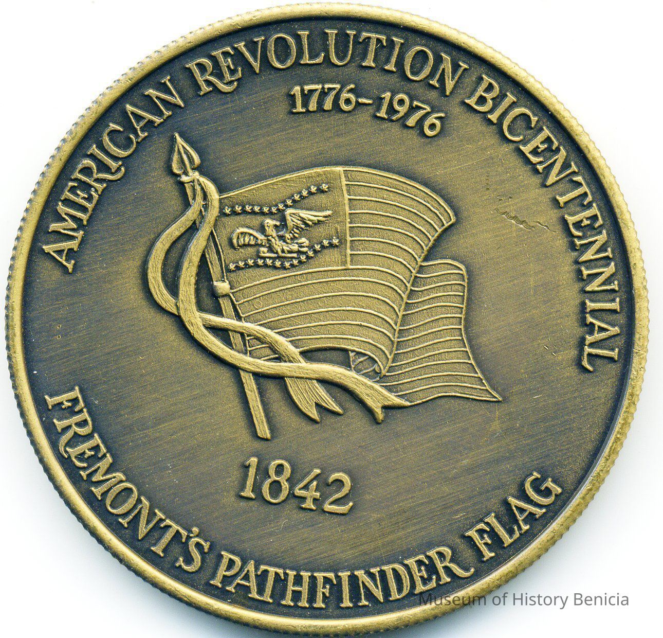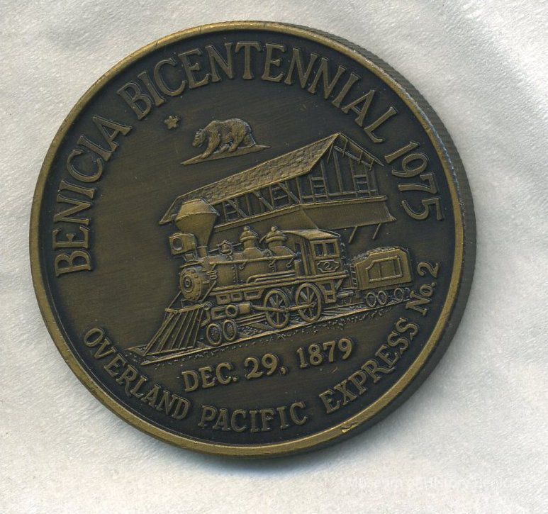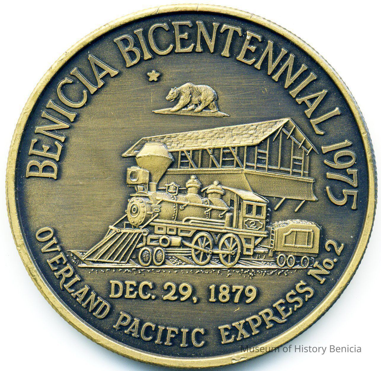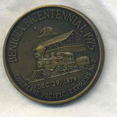 Commemorative Coin - 1-1/2" bronze metal - "Benicia Bicentennial 1975" "Overland Pacific Express No. 2 Dec. 29, 1879" with a representation of a RR engine and depot on front; on back: "American Revolution Bicentennial 1776-1976" and "Fremont's Pathfinder Flag 1842" with a representation of the flag in the center.Collection