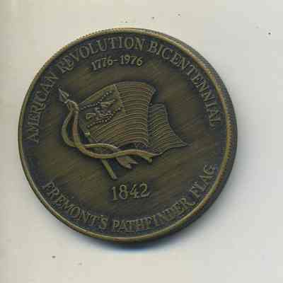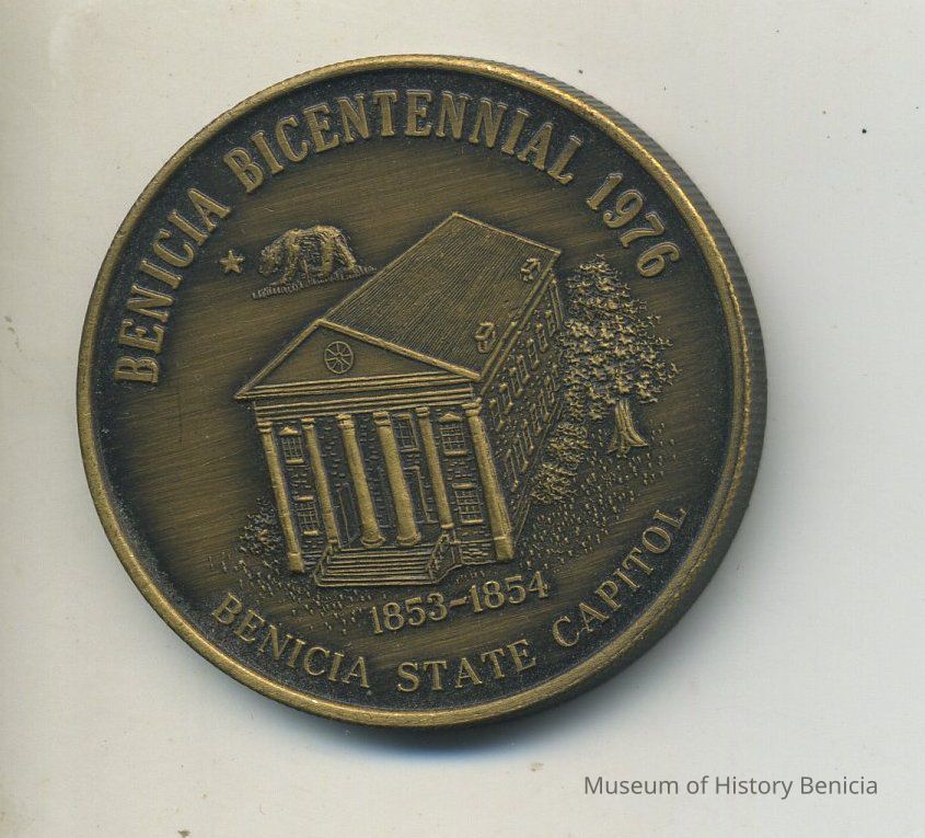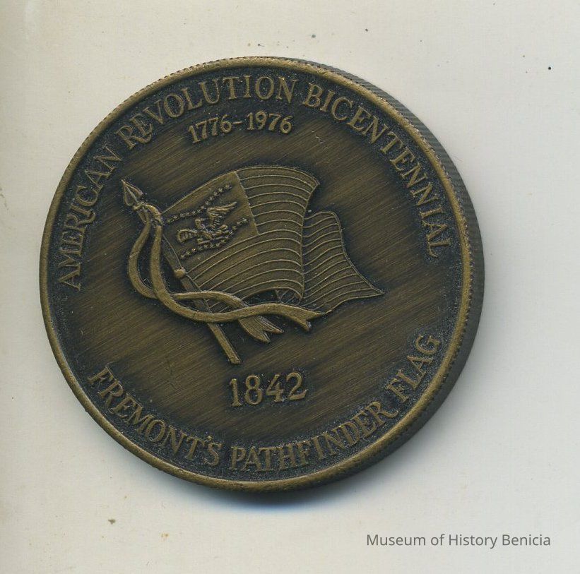 Commemorative Coin - 1-1/2" bronze metal - "Benicia Bicentennial 1976" "Benicia State Capitol 1853-1854" with a representation of the Capitol Building on front; on back: "American Revolution Bicentennial 1776-1976" and "Fremont's Pathfinder Flag 1842" with a representation of the flag in the center.Collection