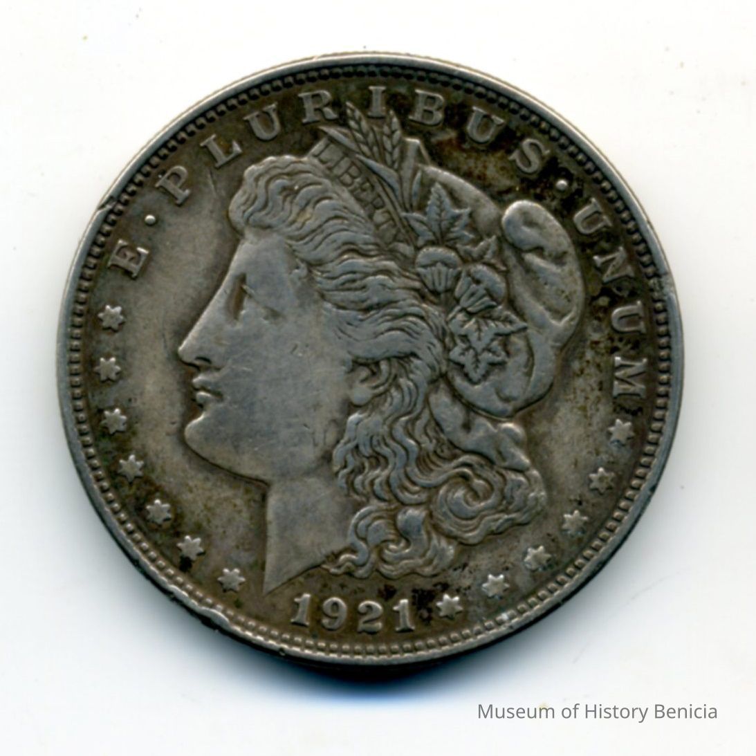 1921 Morgan dollar minted in Philadelphia. 90% pure silver, 10% copper. The coin is named after its designer, United States Mint Assistant Engraver George T. Morgan. The obverse depicts a profile portrait representing Liberty, modeled by Anna Willess Williams, while the reverse depicts an eagle with wings outstretched.Collection