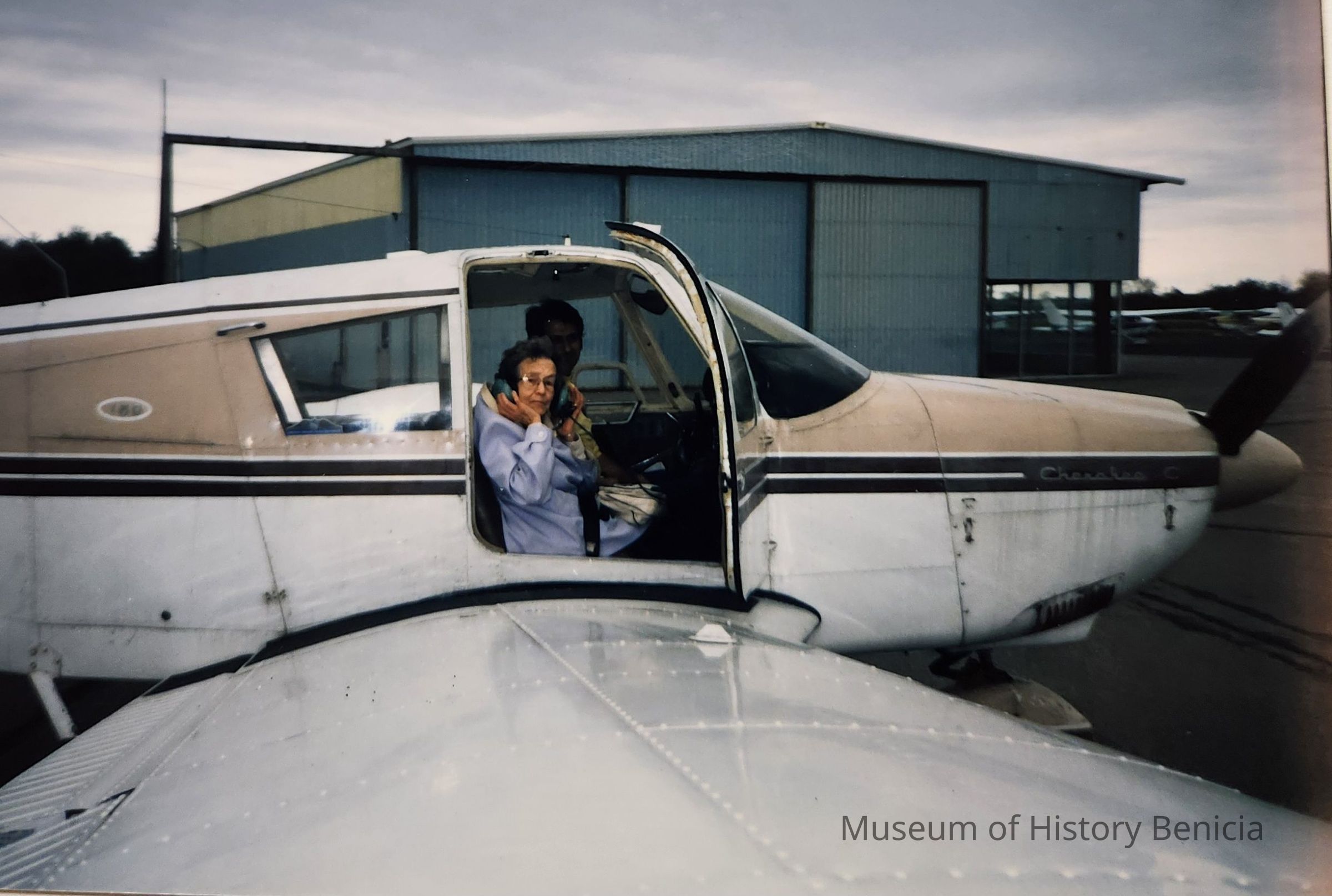 Color Photograph - two adults in a small airplane; the woman is identified as Irma [Atkins]