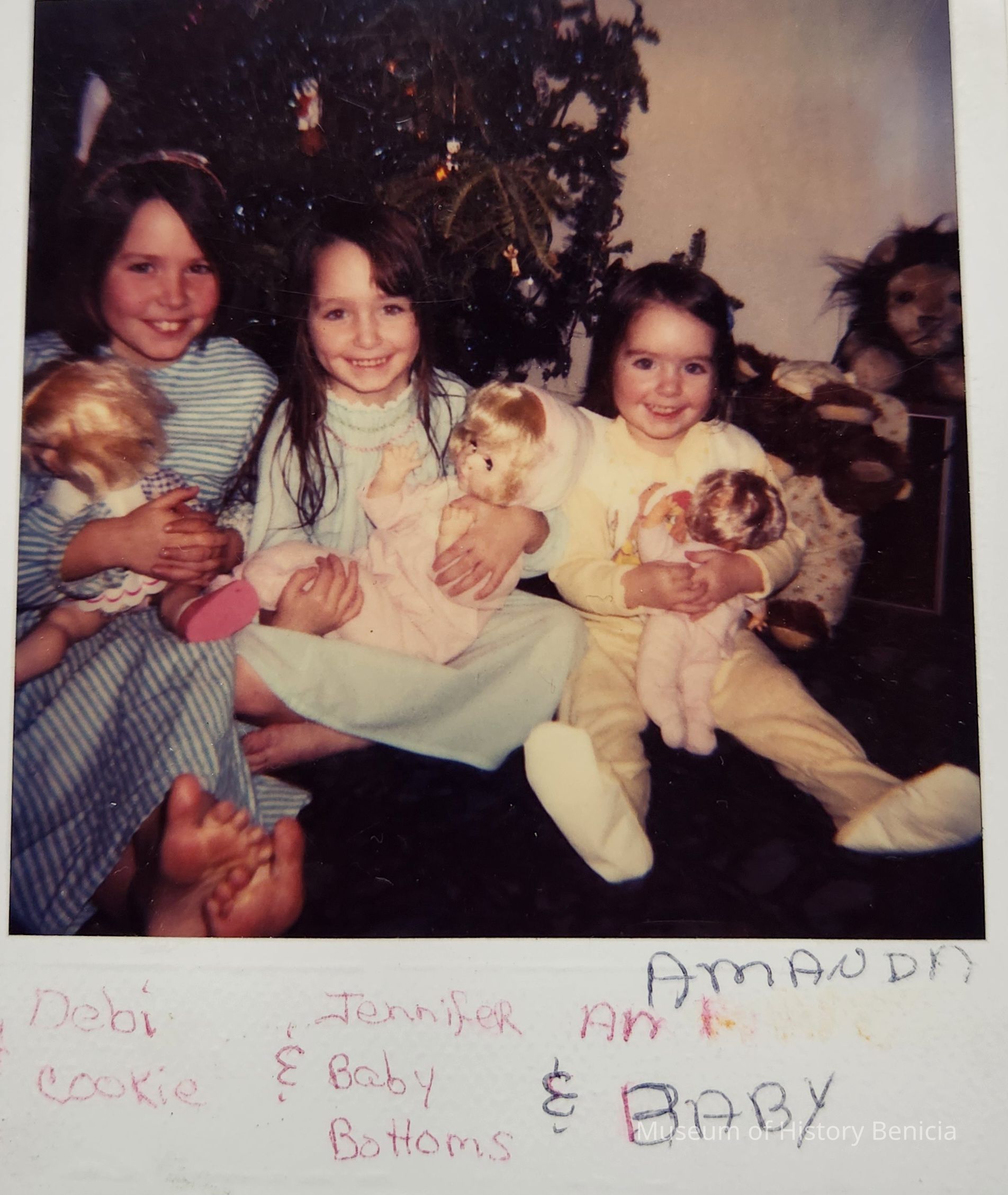 Color Photograph - Polaroid image of three girls with dolls; there is a Christmas tree in the background.
