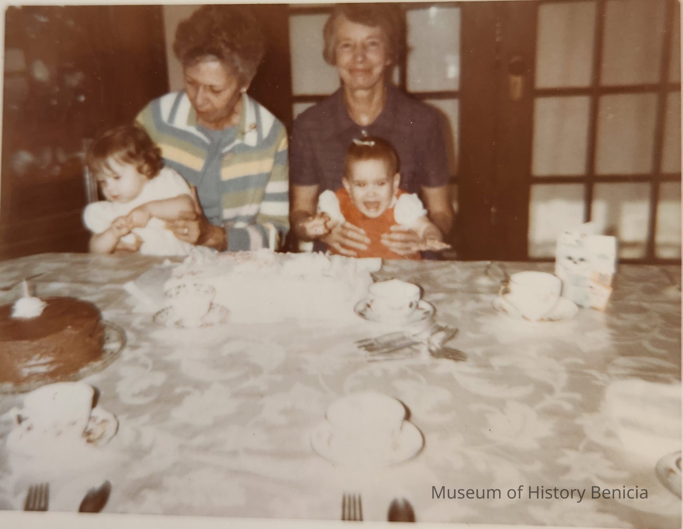 Color Photograph - two older women with two babies. The woman on the right is Helen Henderson. It appears they are at a birthday party.
