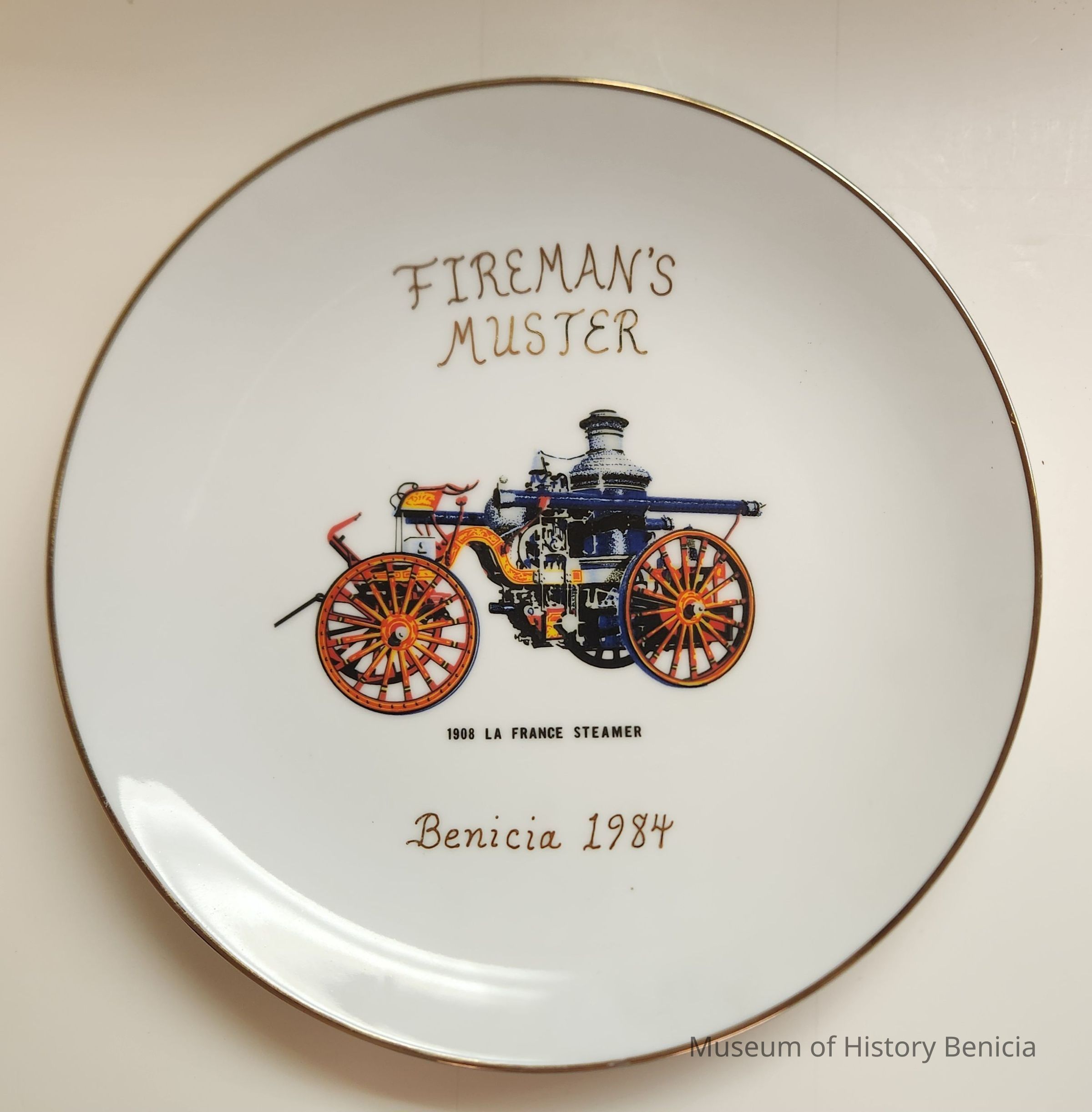 Commemorative white ceramic plate with gold rim, colored design and gold lettering