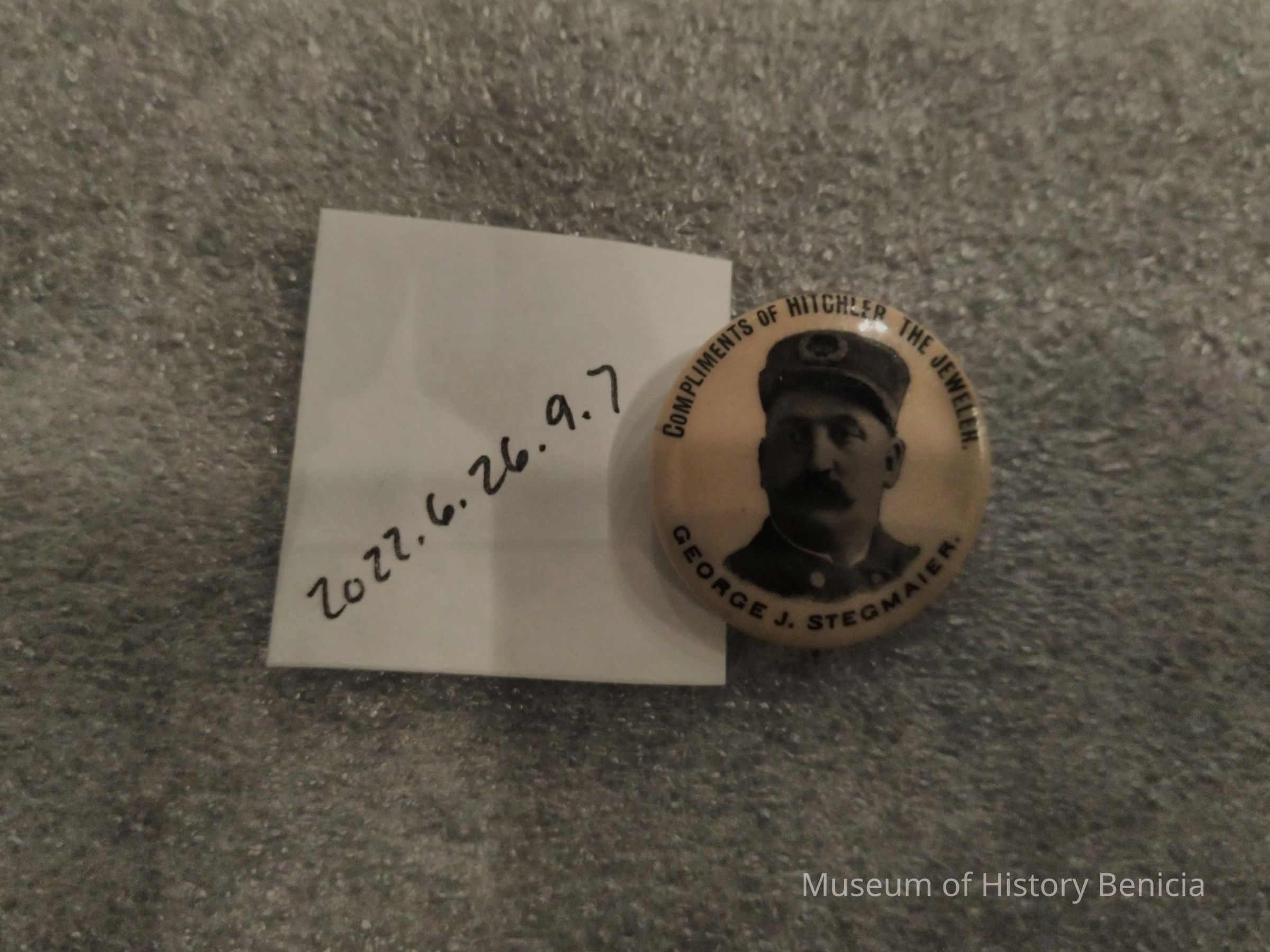 Pin with image of firefighter on front - Compliments of Hitchler the Jewler - George J. Stegmaier