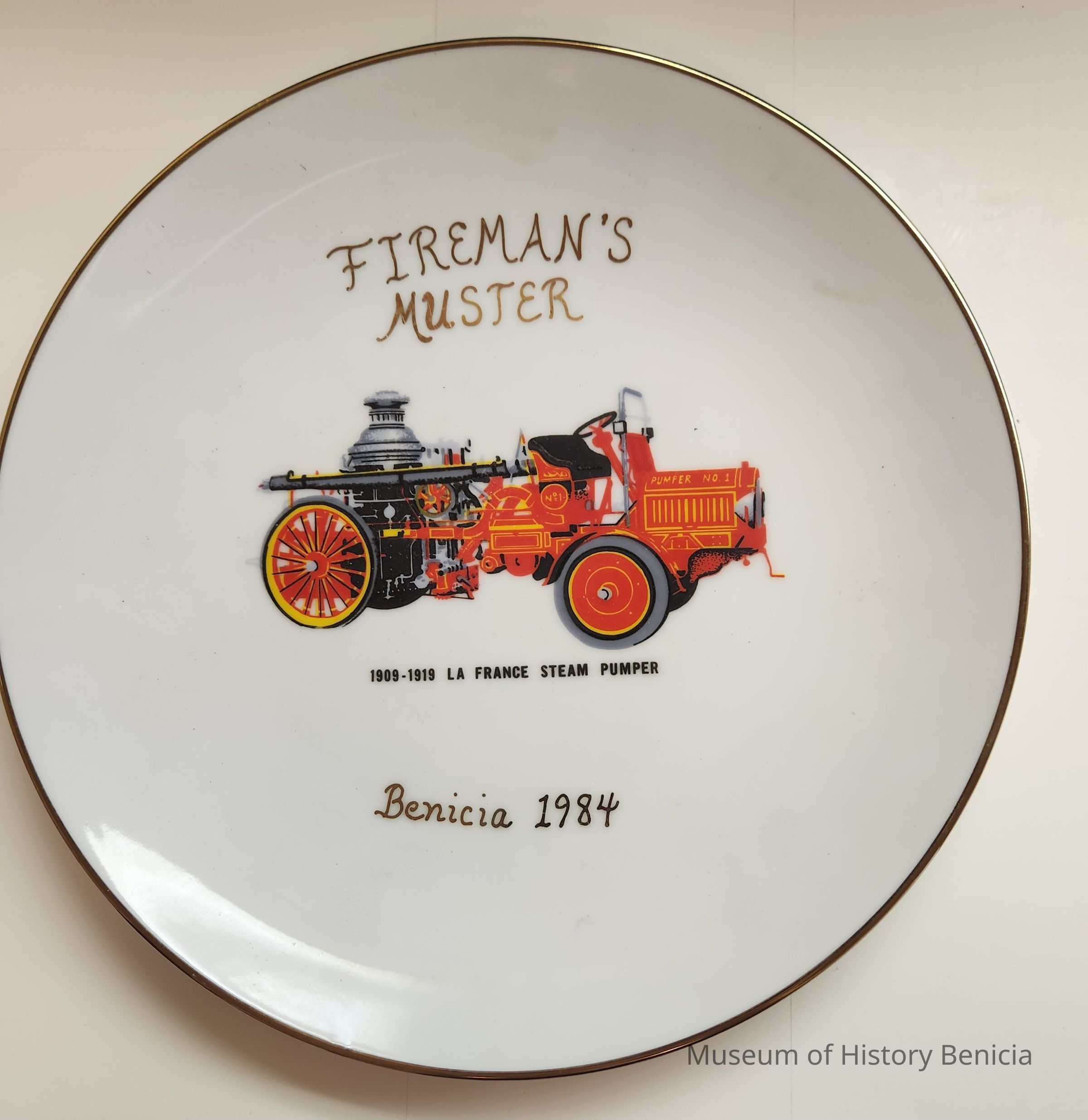 Commemorative white ceramic plate with gold rim, colored design and gold lettering
