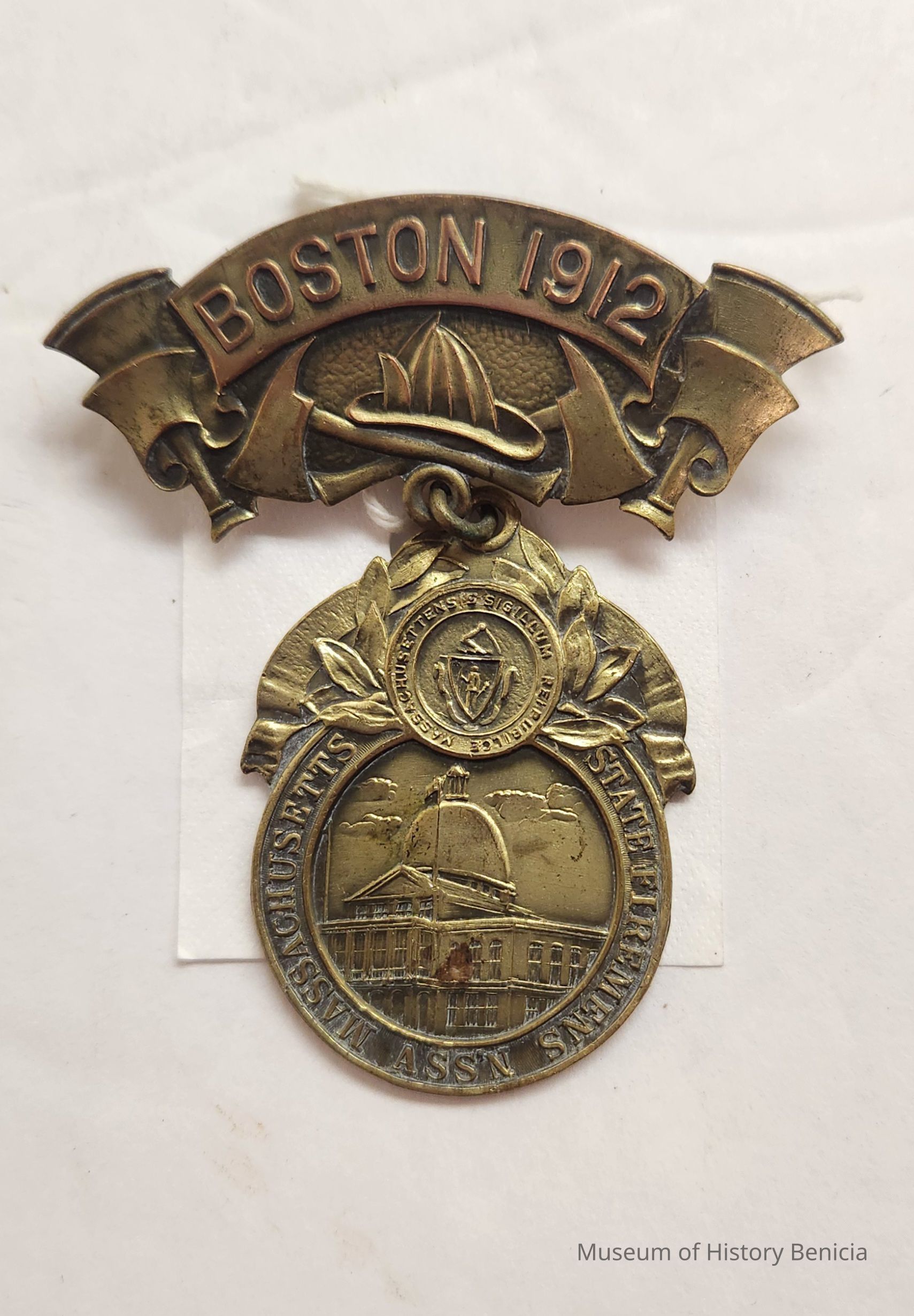 Commemorative medal with Boston 1912 on top portion of medal and bottom attachment which reads Massachusetts State Firemen's Assn.