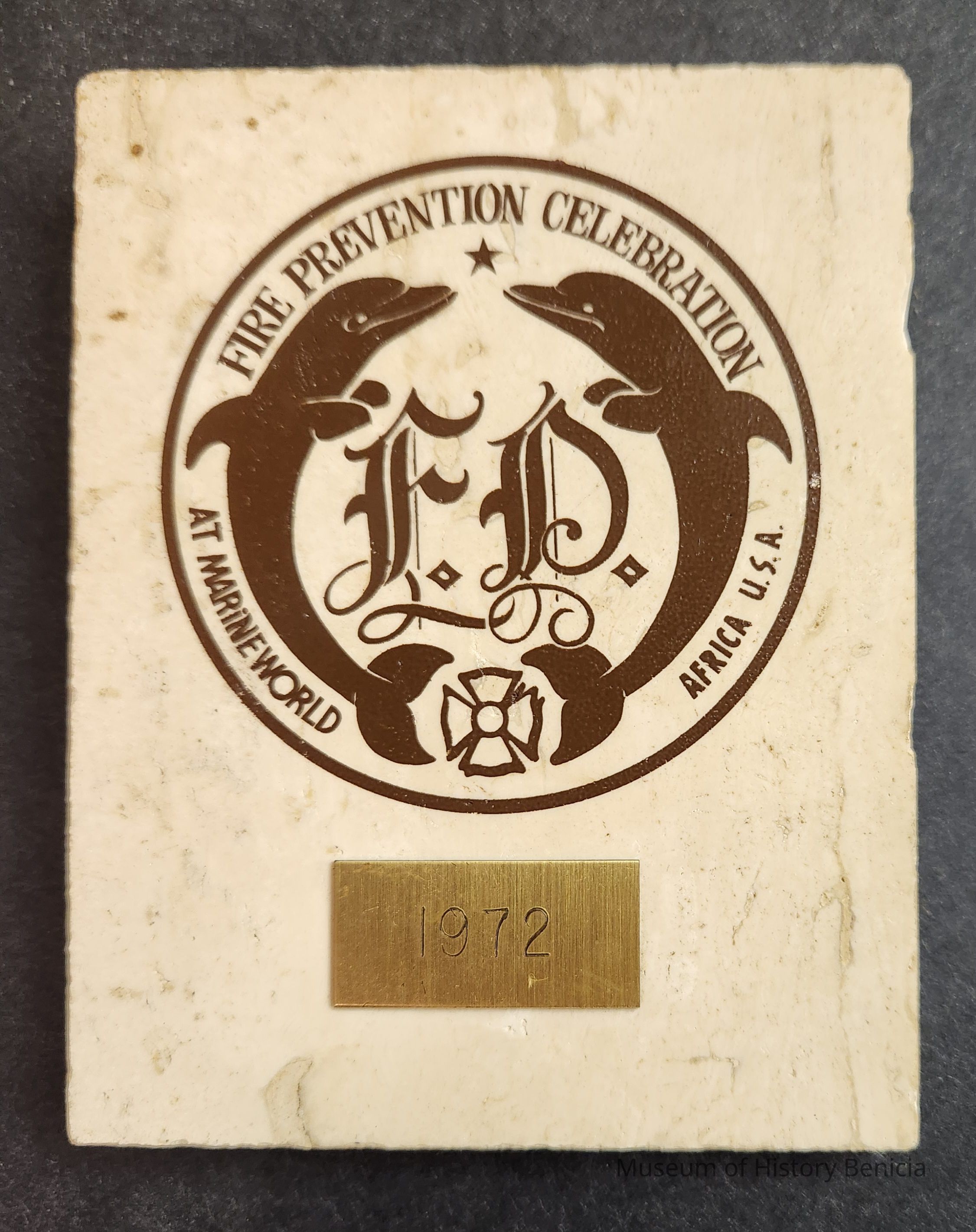 Inscribed tile of two dolphins facing each other with script "F D" lettering in center; gold-like plated 1972 piece below the art work