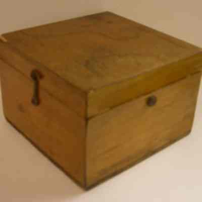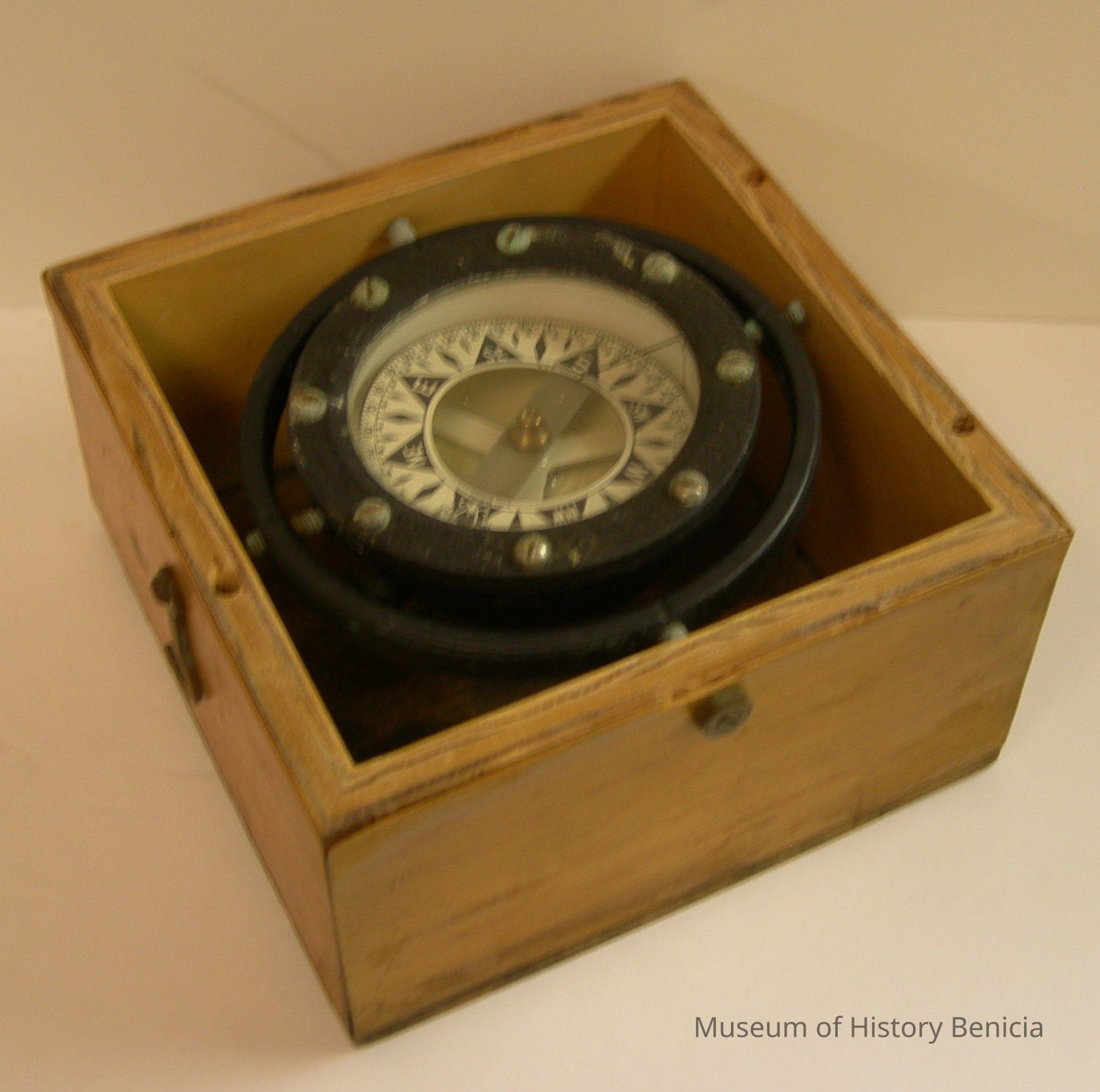 compass 3-1/2" diameter, outer ring 4-1/2" diameter; wooden box 5-3/4" square 3-3/4" tall with lid closed; lid is held on by hooks on two sidesCollection