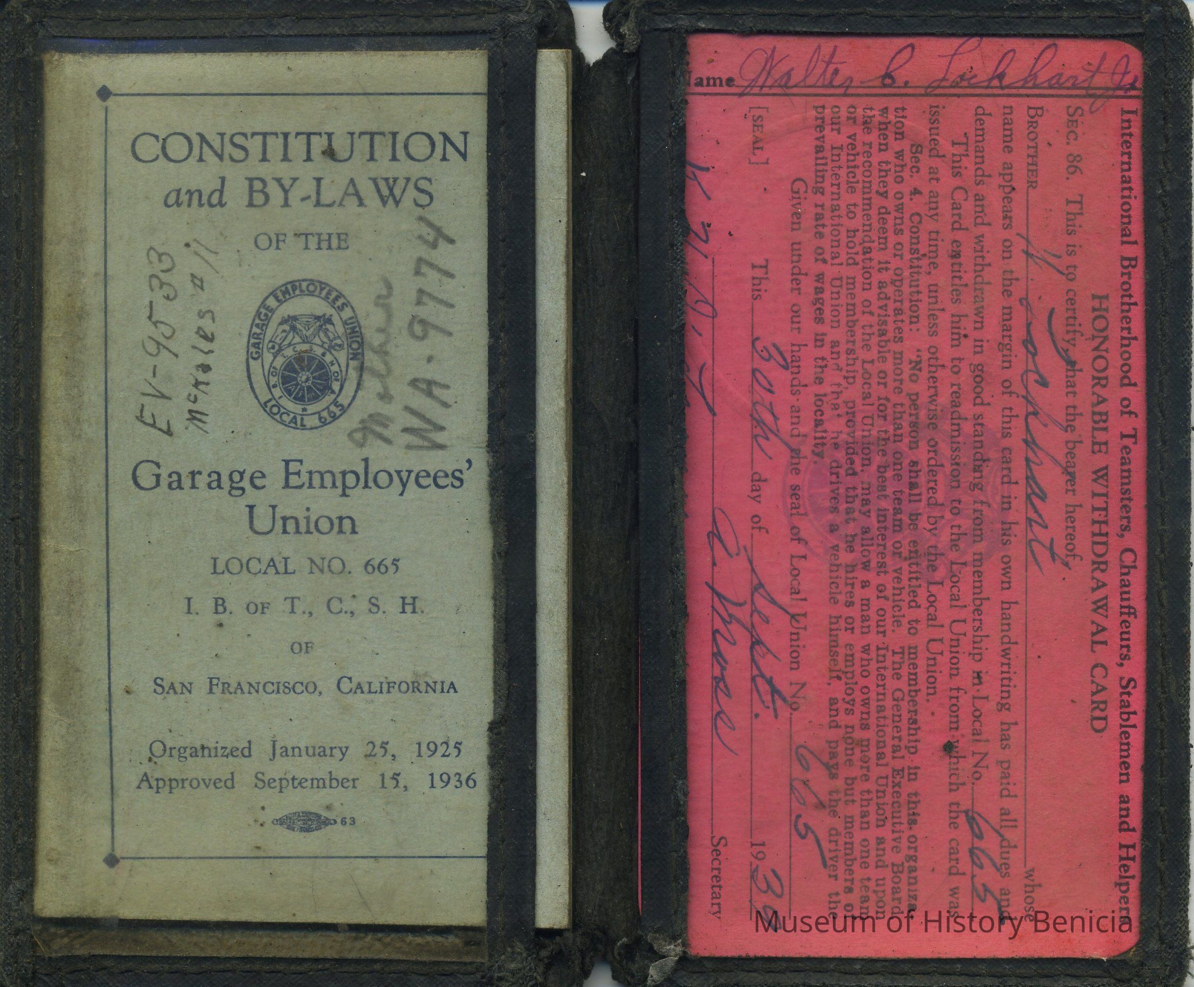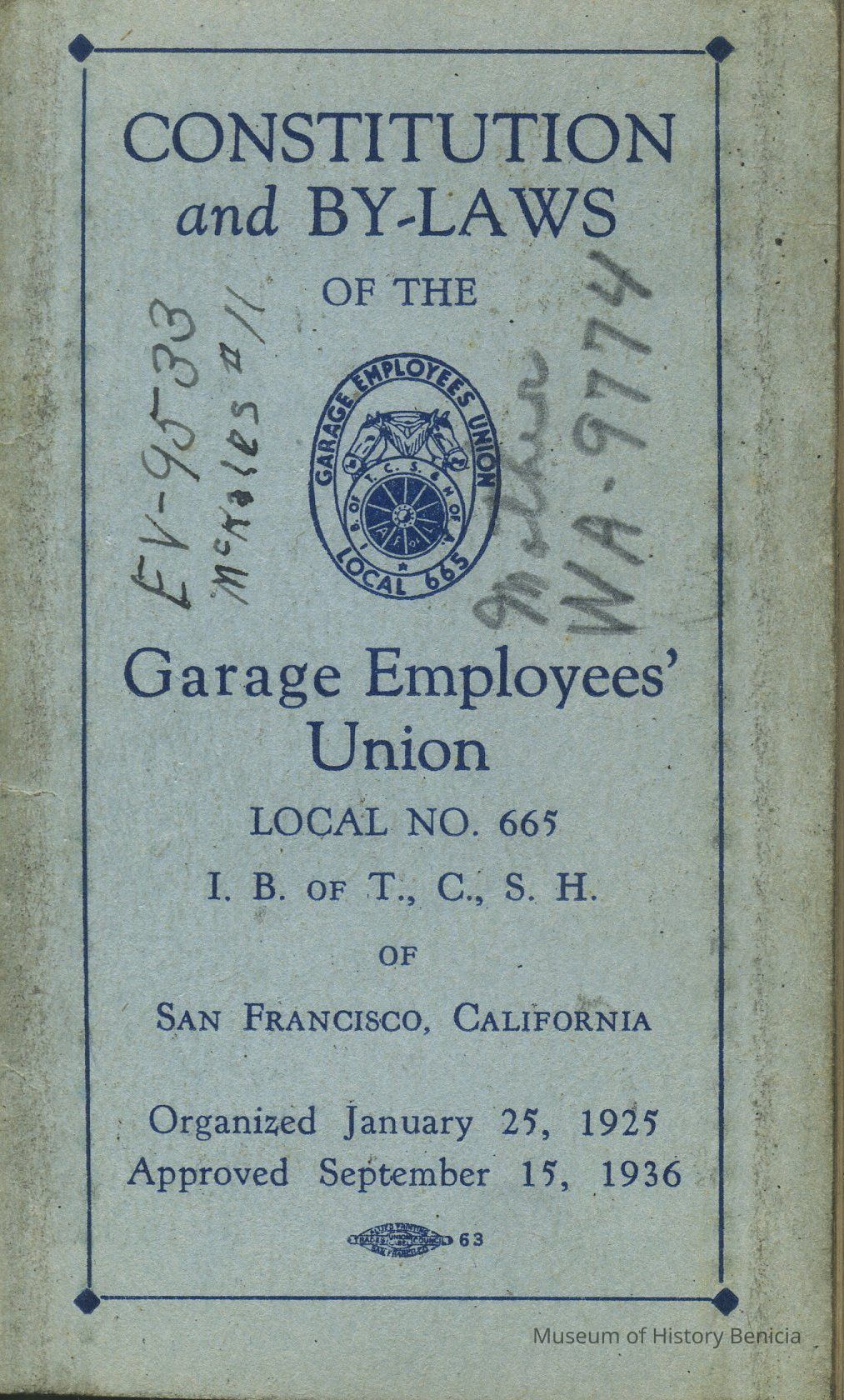 Booklet - Constitution and By-Laws of the Garage Employees Union Local No 665 IBof TCSH (teamsters) of SF Ca, organized January 25, 1925, approved Sept 15, 1936