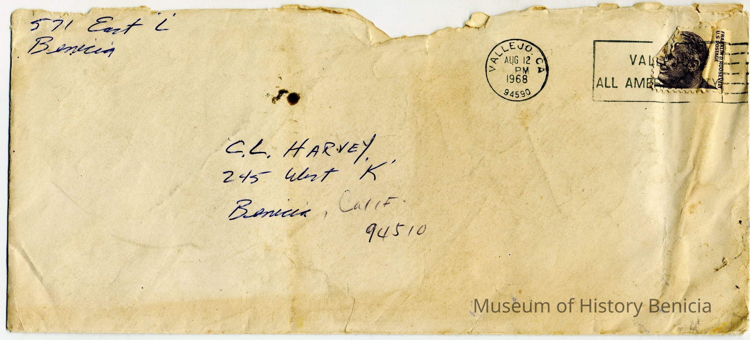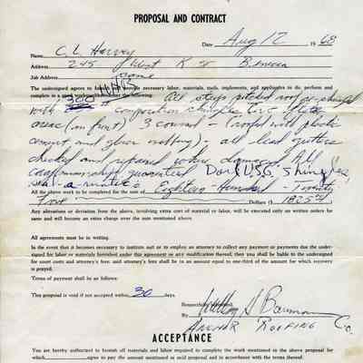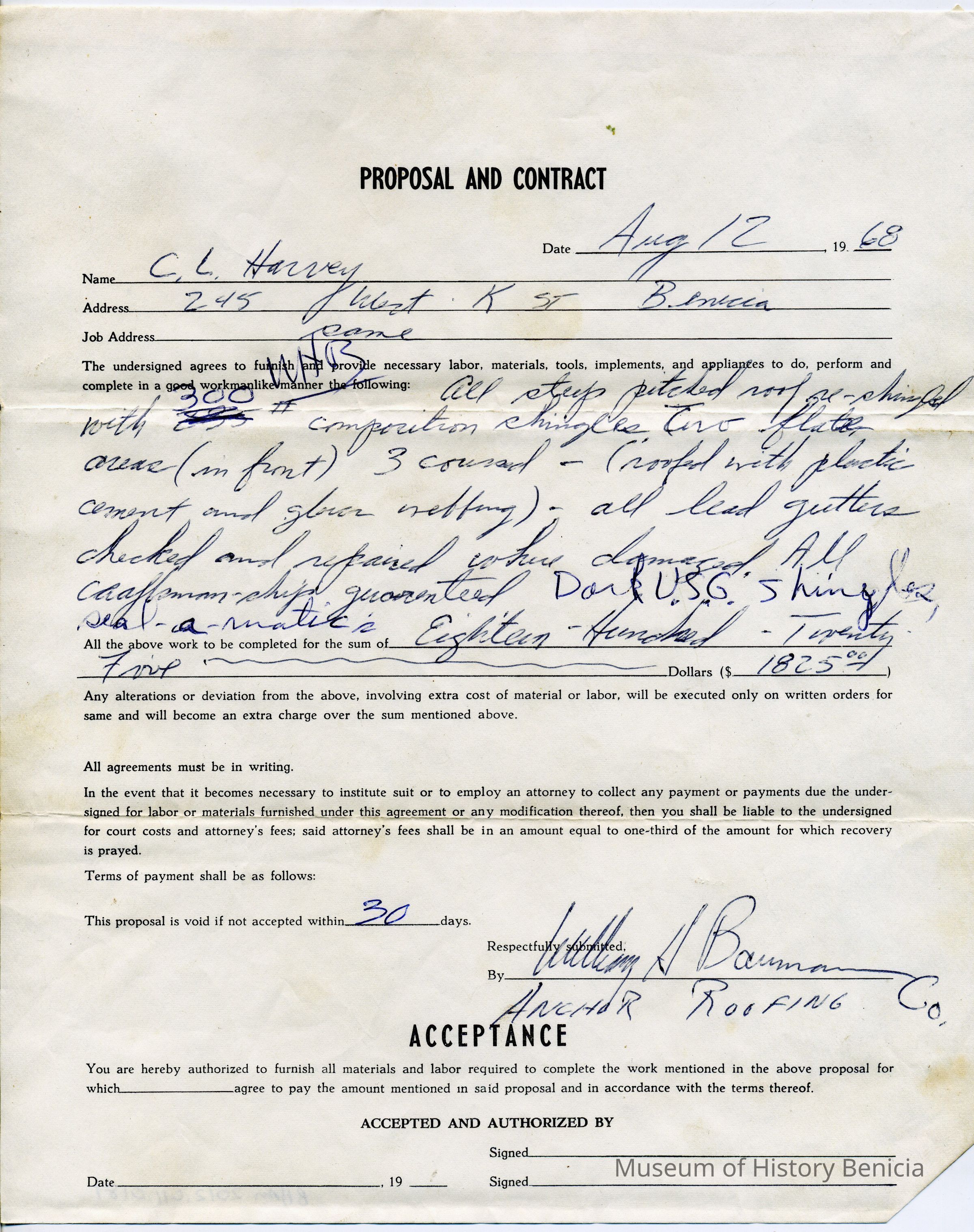 Contract for re-roofing the house at 245 West K St in Benicia. The proposal is from William H Bauman of Anchor Roofing Co. The proposal was made to C.L. Harvey on Aug 12, 1968.Collection