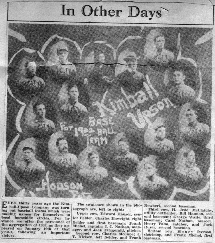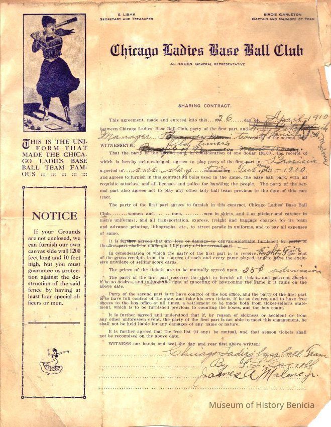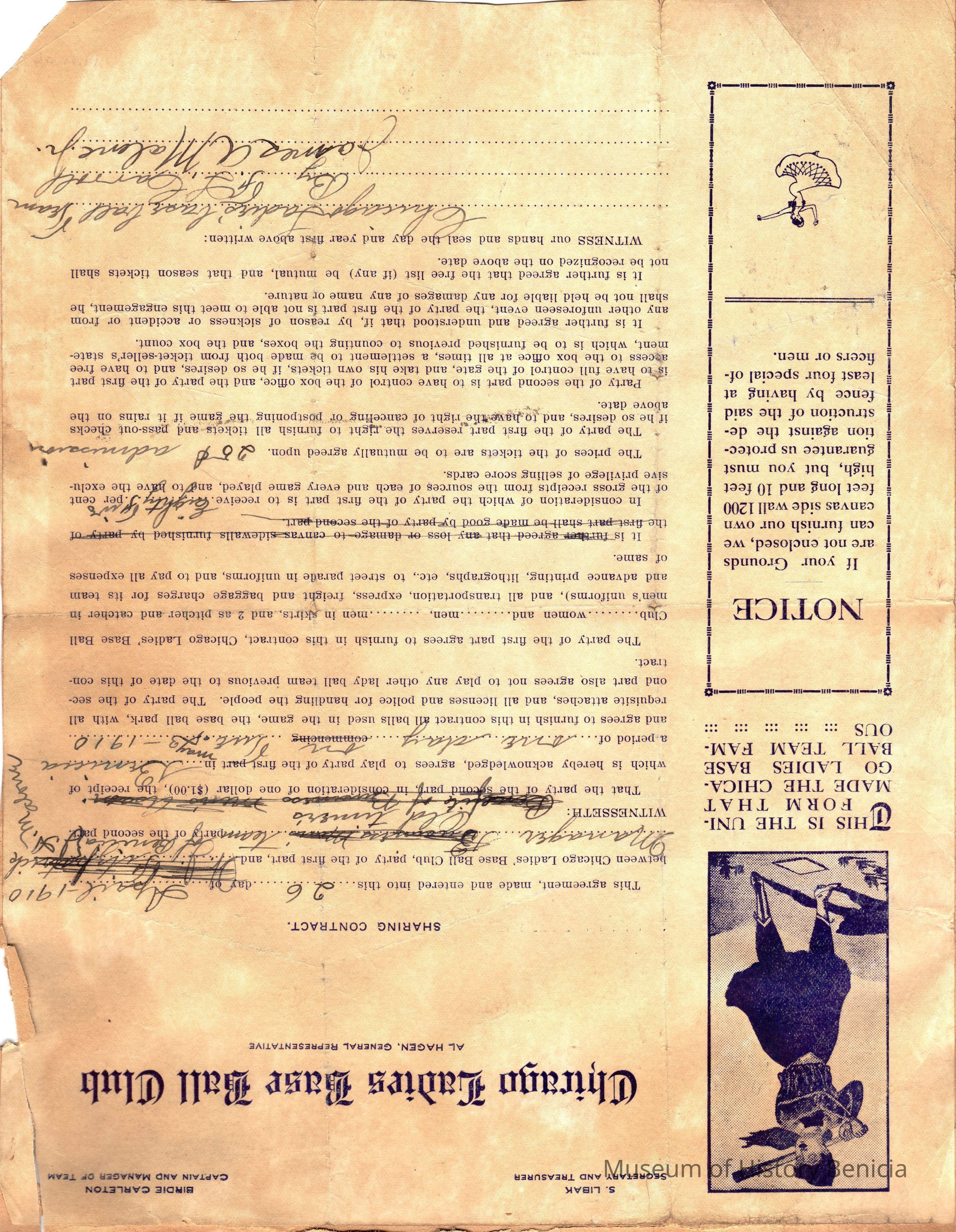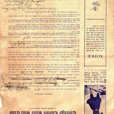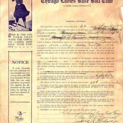 Contract with the Ladies Baseball Club of Chicago and John McClain from 1910. It is pasted to a brown scrapbook page and on the back is a newspaper clipping showing old time baseball players.Collection